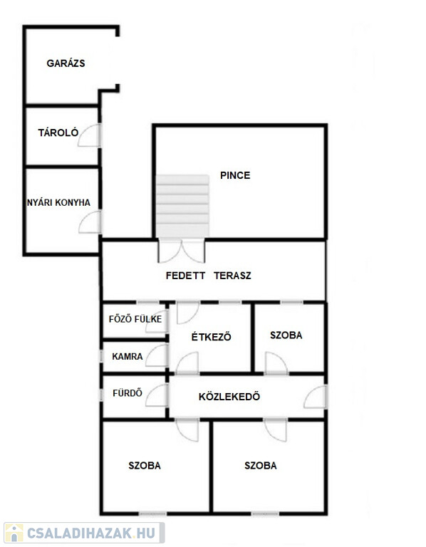 Az ingatlanban található három szoba (19 nm, 18,65 nm, 8,19 nm), egy közlekedő (7,35 nm), egy főzőfülke (3,09 nm), egy étkező (11,46 nm), egy spejz (2,4 nm), és egy fürdőszoba wc-vel (3,84 nm) egy helyiségben. A telken még megtalálható egy nyári konyha (15,73 nm) egy tároló (12,92 nm) egy garázs (15 nm) és egy nagy pince kb. (30 nm)