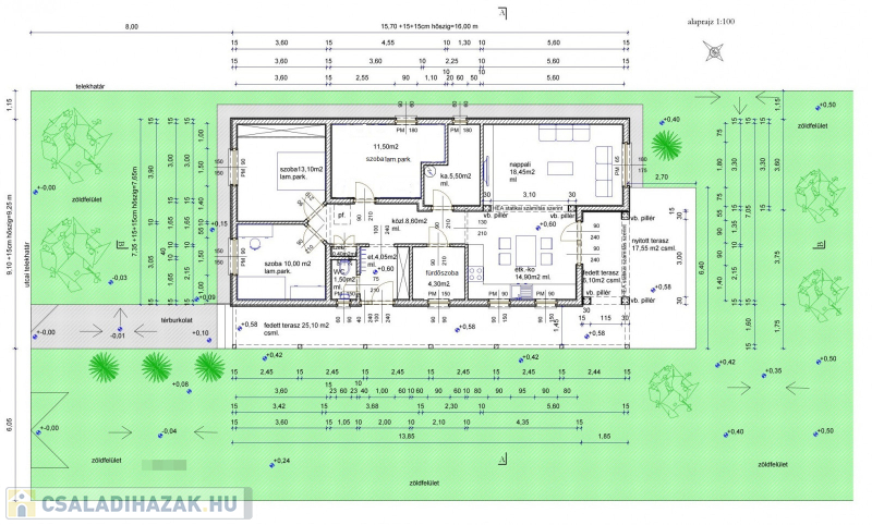 A villany 3×16 A, H tarifához előkészítve. A nagykapu elektromos lesz befejezésre vár.