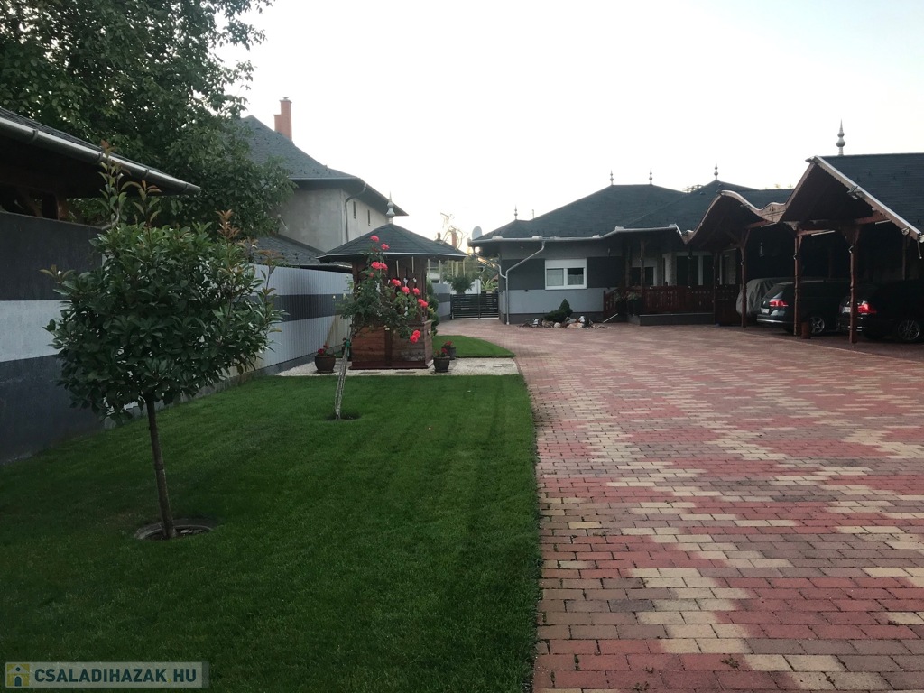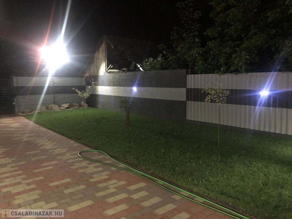 Udvar: 450 m2 teljes egészében viakolor burkolattal fedve, nagy előkerttel, 2 db sziklakerttel. 2 db elől-hátul lévő utcafronton elektromos nyíló kapu, fúrt kútról víz vételi lehetőség, gyepszőnyeg locsolására alkalmas elektromos öntöző rendszer – kútról ellátva vízzel (nem vezetékes víz).