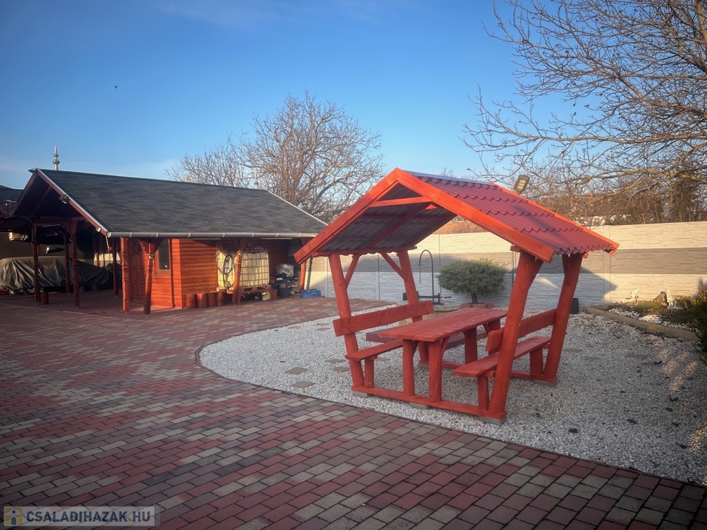 Melléképület: 5mx3m-es zárt faház + 3 autó beállására alkalmas fedett szín tegola tetős faszerkezettel