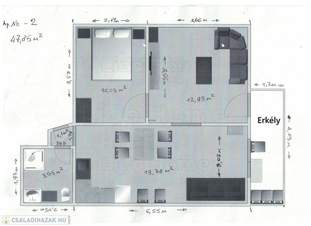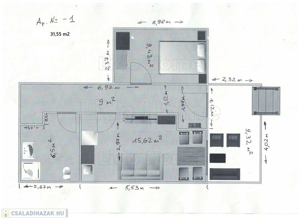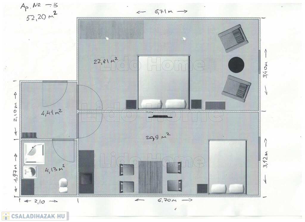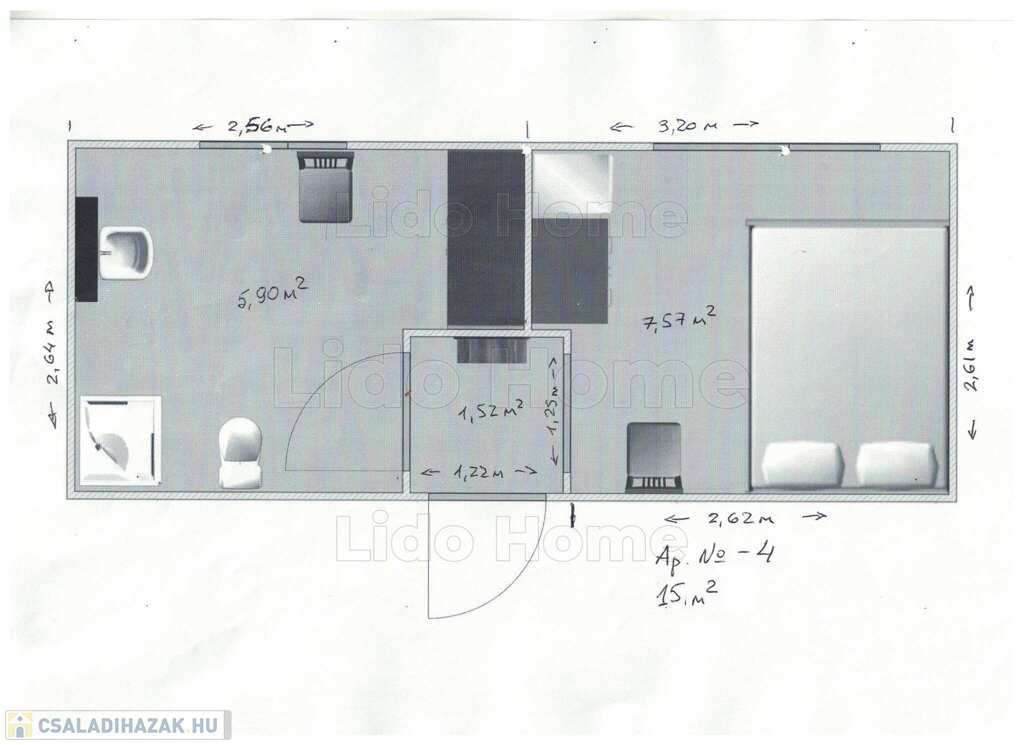 - apartman 3 (2 fő részére): 1 hálószoba, nappali-konyha-étkező, fürdőszoba zuhanyzóval+WC