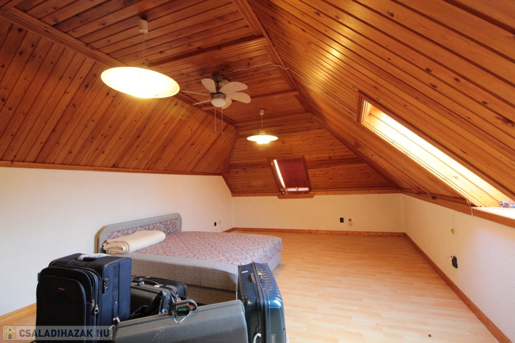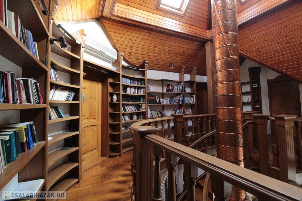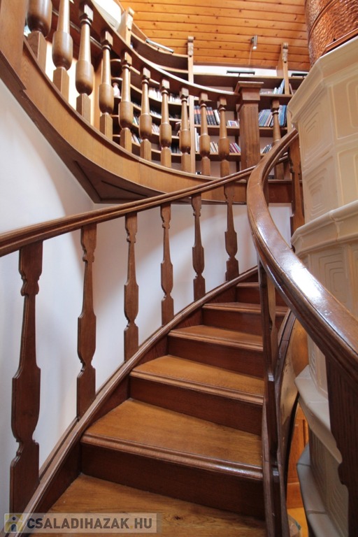 Masszív tölgyfa lépcső vezet az emeleti galériába, ahol egyedi könyvespolcok mellett haladva három szoba, mosókonyha és egy további fürdőszoba (kád, tusoló, WC) található.