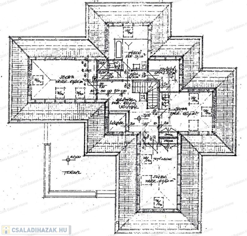 - tetőtér: 3 hálószoba, 1 fürdőszoba zuhannyal, káddal és WC-vel, mosókonyha
