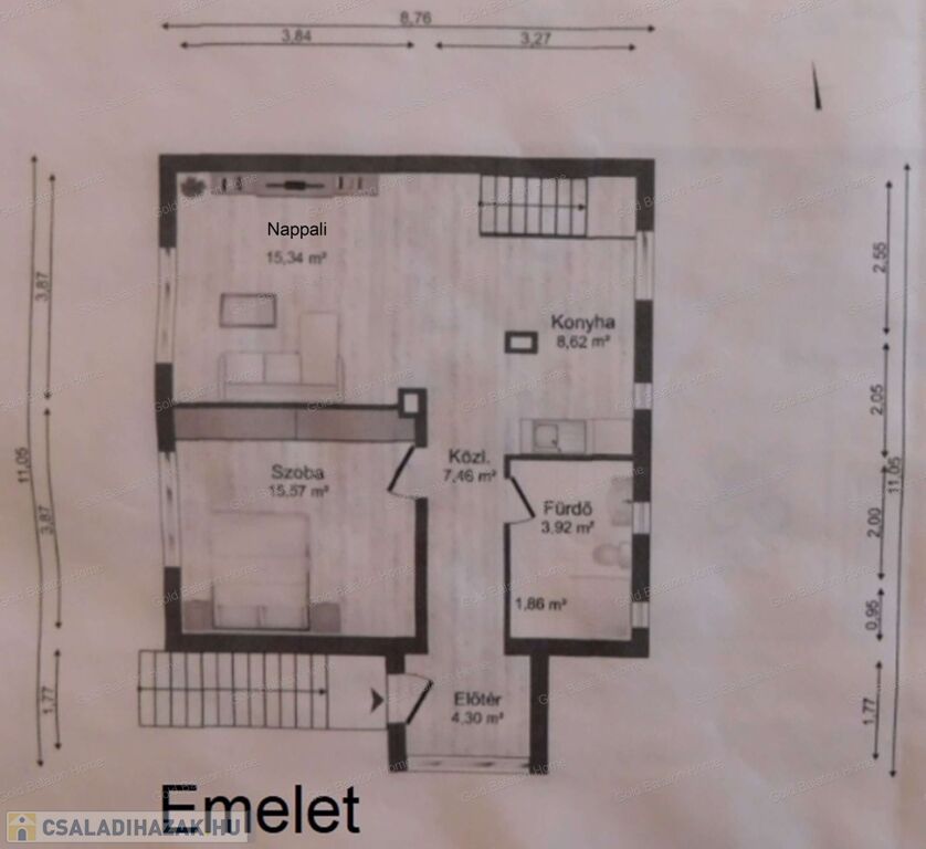 - emelet: előtér, közlekedő, hálószoba, amerikai konyhás nappali-étkező