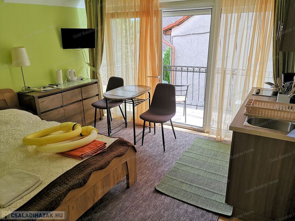 - 2. emeleten összesen 3 apartman: 2 db stúdió (szoba, zuhanyzó + WC, erkély) és 1 db. 2 szobás apartman (konyha-étkező-nappali, hálószoba, zuhanyzó+WC, erkély)