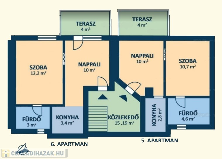 • Felső szint: Két külön apartman, mindegyik nappalival, konyhával és fürdőszobával.