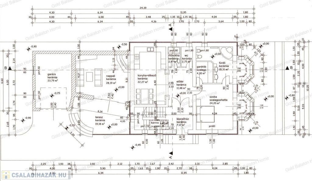 - Földszinti helyiségek: amerikai konyhás nappali 50,46 m2, szoba 24,2 m2, fürdőszoba 15,31 m2, gardrób 4,3 m2, mosókonyha 2,97 m2, külön WC 2,75 m2, kamra 1,9 m2, előtér 11,48 m2, lépcsőház 7,17 m2, terasz 19,18 m2, garázs 23,79 m2.