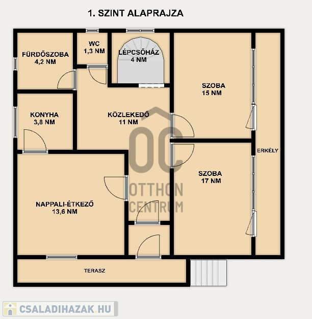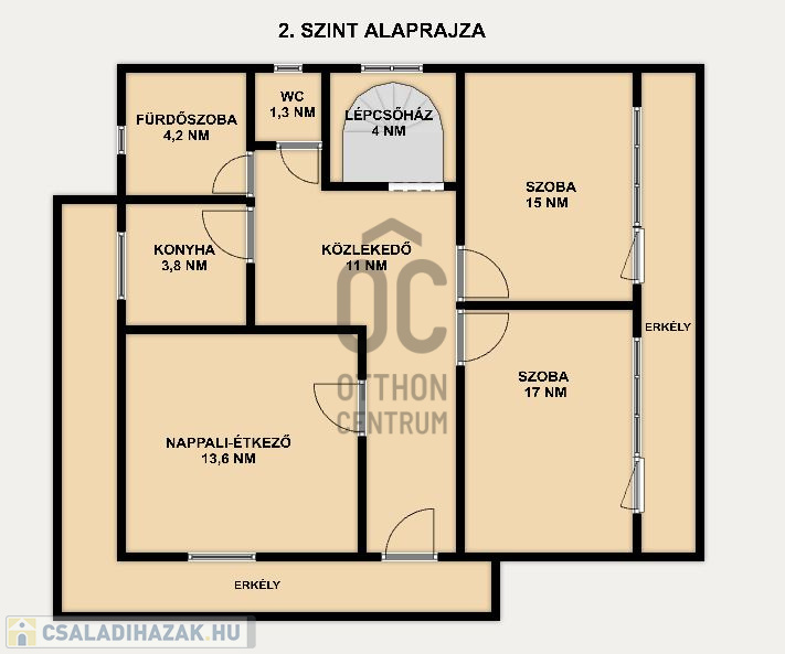 - 1. szint: 2 szoba, nappali-étkező, konyha, közlekedő, fürdőszoba, WC, lépcsőház, erkély összesen 70 nm hasznos alapterületű