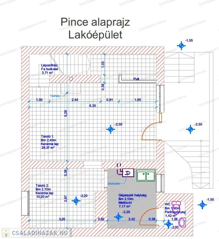 - pinceszint: háztartási helyiségek, tárolók, sport- és kikapcsolódásra alkalmas terekkel, kandallóval
