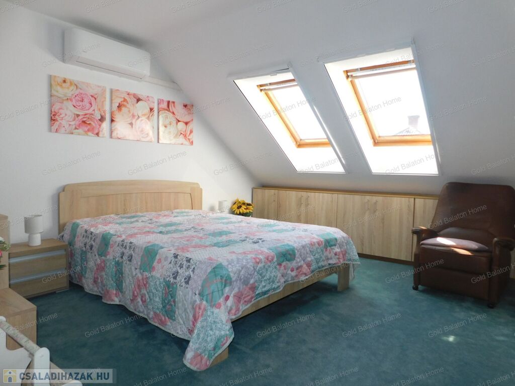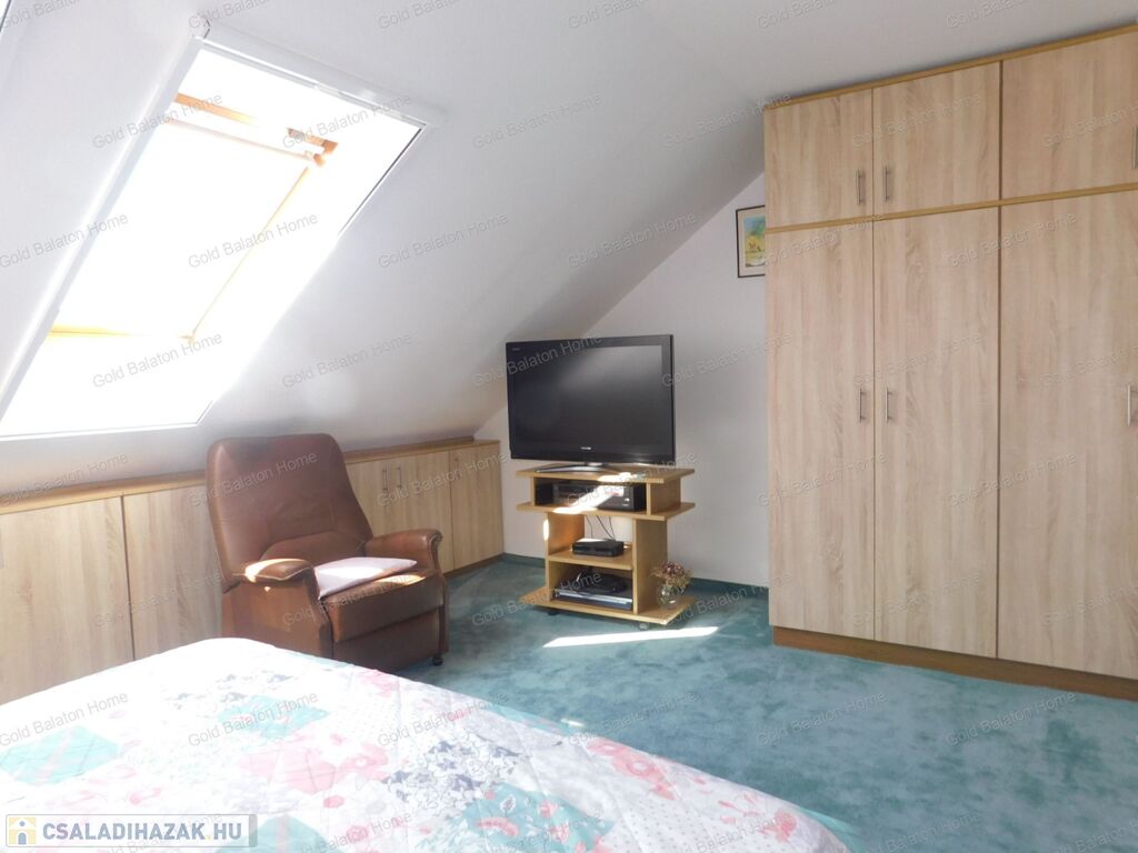 Tetőtéren külön lakrész épült: szoba, fürdőszoba, gardrób helyiségekkel.