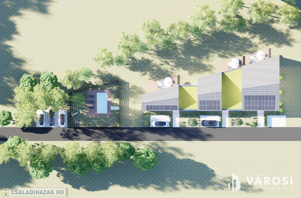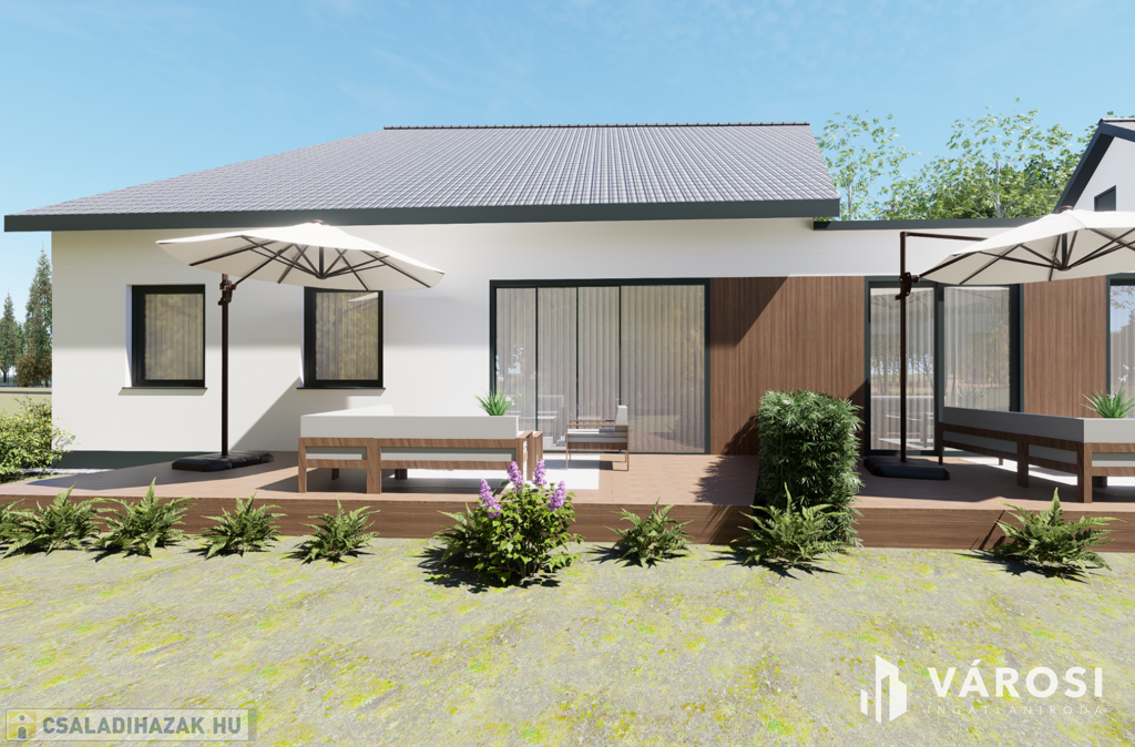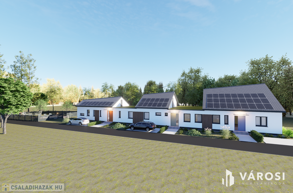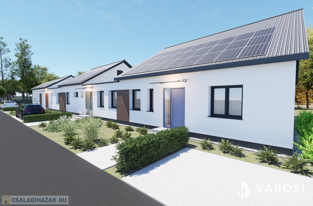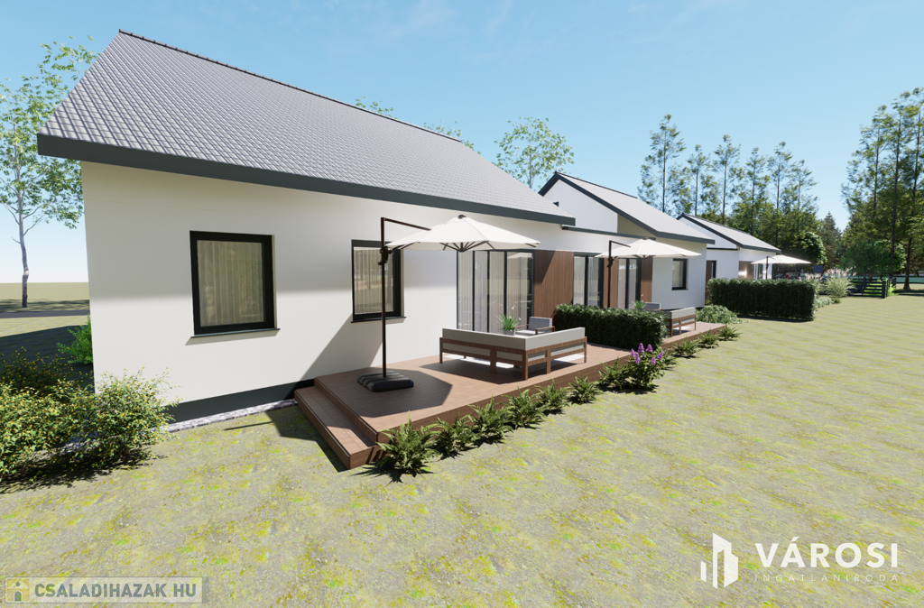 Eladó Hódmezővásárhelyen, Új-kishomokon a Mező utcában, új építésű 3 lakásos sorházban, 115,55 m2 hasznos alapterületű tégla ház. Az amerikai konyhás, nappali + 3 hálószobás ház remek tájolású, kényelmes életteret biztosít 4-5 fős család számára. Az ingatlanhoz ~ 420 m2 önálló kertrész tartozik, valamint társasház részére tervezett közös (6,00m x 3,00m) medence és napozótér.