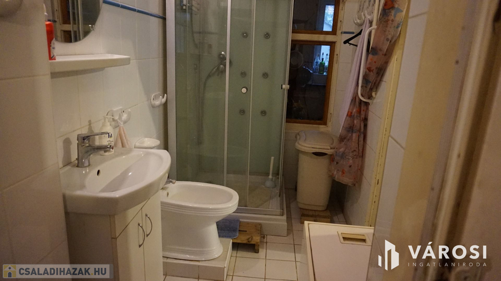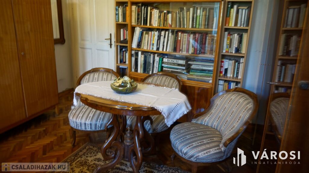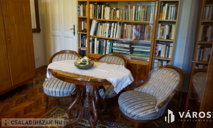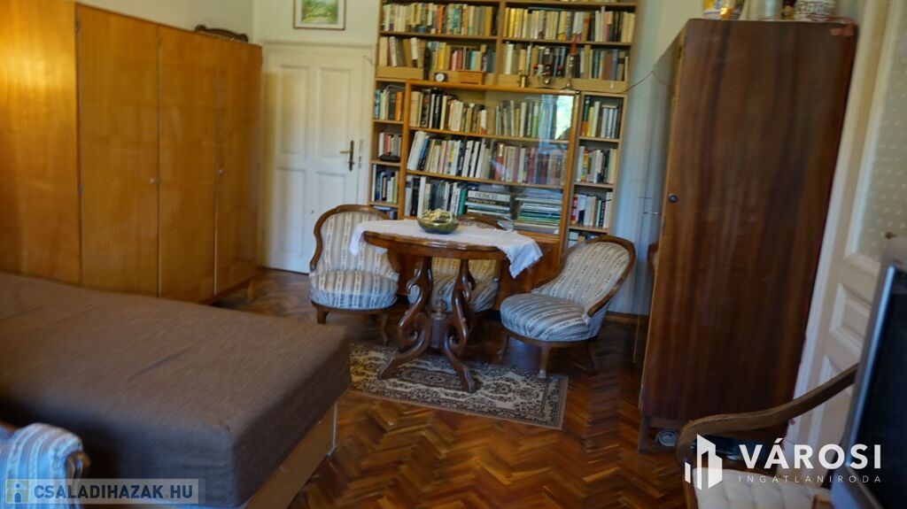 Az egész ingatlant áthatja a polgári életvitelre jellemző berendezés, bútorzat, tágas szobák, a polcokon a temérdek könyv. A lakásnak 2 bejárata van, egyik a kapualjból nyílik, másik a teraszról. A teraszról az előtérbe lépünk először /4 m2/, innen nyílik egy 10 m2-es szoba és a konyha /9 m2/, valamint a toalett /1 m2/. Az egész lakás körbejárható: a kisszobából tovább haladva a két 21 m2-es egymásba nyíló utcai szobába jutunk. A belső szobából nyílik a 4 m2-es fürdőszoba tusolóval és bidével, ami a konyhából is megközelíthető. Ill van egy 4 m2-es kamra, amely szintén a konyhából nyílik. Fűtése gázkonvektoros, a melegvizet átfolyós vízmelegítő szolgáltatja. Kisebb felújításokat végeztek az ingatlanon az utóbbi években, ekkor készült el a fürdőszoba, az utcai fal vízszigetelése, a kapualj hőszigetelése, ill az utcai ablakok cseréje. Viszont egy átfogó felújítás, korszerűsítés az új tulajdonos feladata lesz. Az ingatlan kiváló elhelyezkedése miatt minden gyorsan elérhető: bölcsőde, óvoda, iskola, buszmegálló, üzletek, éttermek, zöldséges, orvosi rendelő, gyógyszertár.