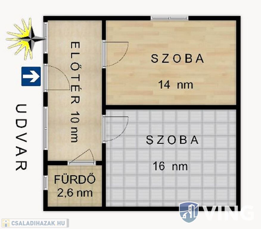 A lakásba belépve jobbra az amerikai konyhás étkező, balra pedig a nappali található, amelyből további két szoba nyílik. A szobák parkettások, a többi helyiség hidegburkolatú.