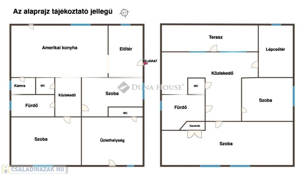 A földszinten amerikai konyhás nappali, hálószobák, fürdőszoba és külön WC található, az emeleten pedig további hálószobák, egy fürdőszoba, WC, valamint egy tágas terasz.