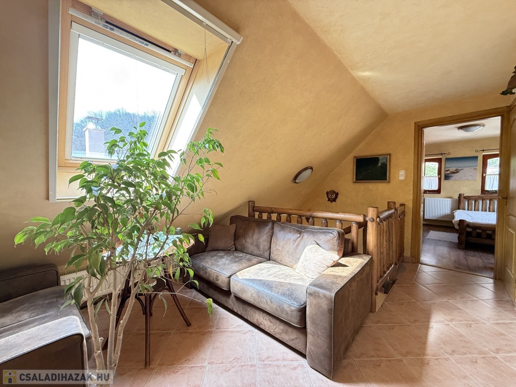 A felső szinten, a szint két legtávolabbi részén van két nagyobb háló, közöttük közösségi tér. Innen nyílik egy kisebb szoba, mely alkalmas lehet irodának, gardróbnak is, plusz a fürdő és a különálló wc is.