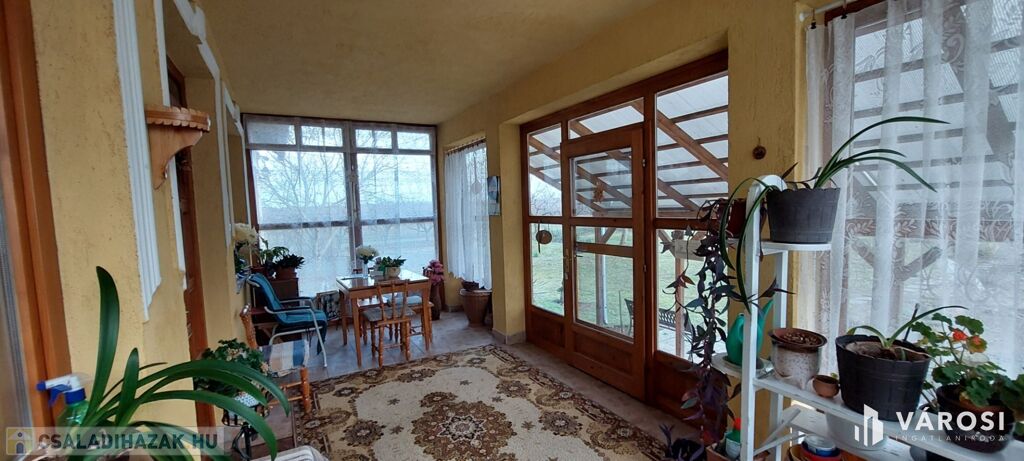 Földszint: tágas nappali–étkező galériás légtérrel, 3 különnyíló hálószoba, konyha + kamra, fürdőszoba, külön WC, közlekedő, kazánház. Déli tájolású, zárt terasz / télikert, ahonnan 3 irányban nyílik kilátás a parkosított kertre