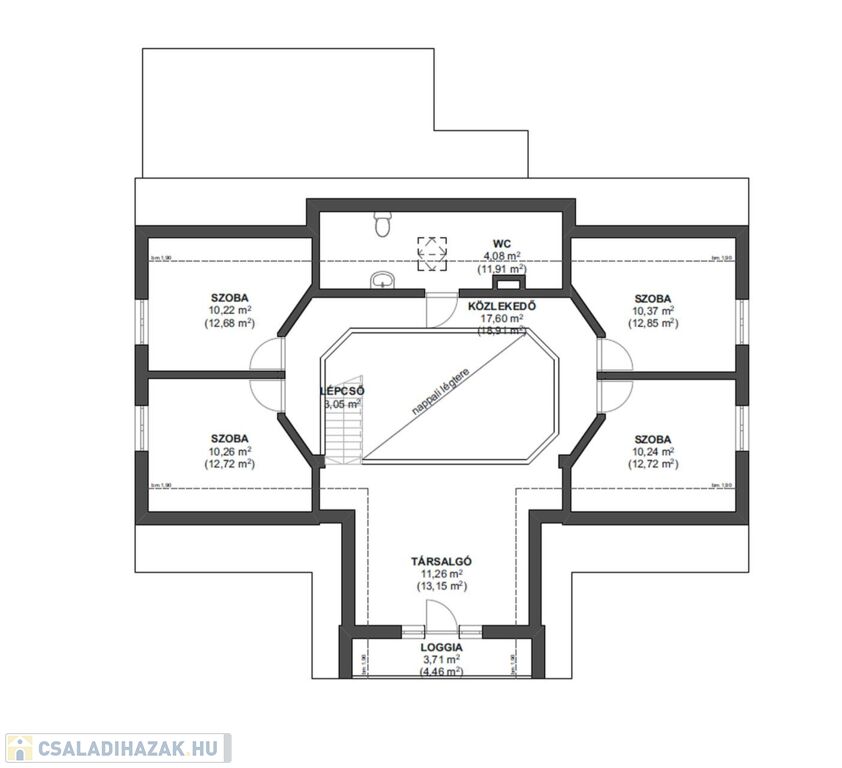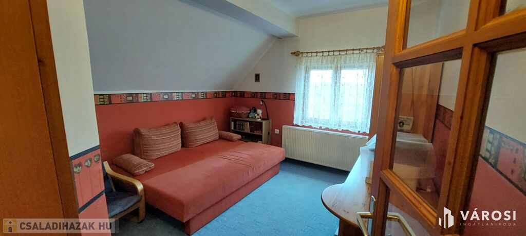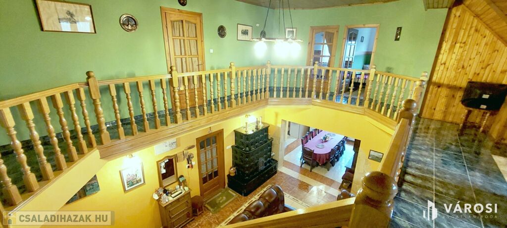 Emelet: galériás körfolyosó, 4 hálószoba, nappali, fürdőszoba + tároló, loggia