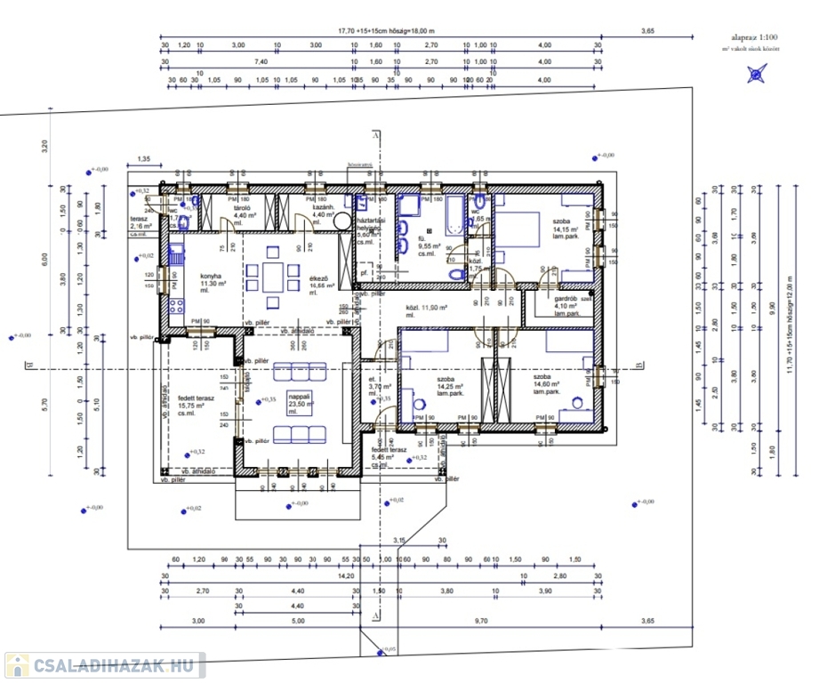 Az ingatlan 719m2-es összközműves intím telken épült magas minőségben magán célból! A ház hasznos alapterülete 143m2 + 3db terasszal ami összesen 23,50m2. A 30-as Ytongból+15cm-es grafitos homlokzati szigeteléssel épült otthon központja az egyedi tágas több mint 51m2-es egyedi hangulatú amerikai konyhás nappali. További helyiségek: 3 szoba, fürdőszoba, külön wc, tároló, háztartási helyiség, kazánház, közlekedő és előszoba helyiségekből áll, valamint egy teraszról megközelíthető külső Wc-vel. Az épület fűtése-melegvízellátása 30kw-os Ariston kombicirkóval biztosított padlófűtésen keresztül, valamint az egész éves kellemes komfortról 5db hűtő-fűtő klíma is gondoskodik. A padló 15cm-födém 20cm szigeteléssel lett kivitelezve. Az antracit leier felületkezelt betoncserép nemcsak kimagasló védelmet nyújt, hanem modern megjelenésével, tartós színvédelmével évtizedekig esztétikus megjelenést kölcsönöz.