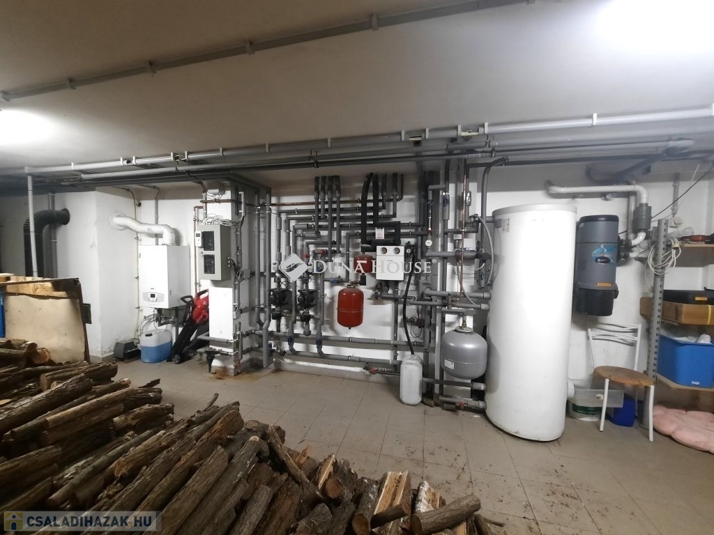 A ház alatt kialakított pincében található a kazánház. A fűtést kondenzációs gázkazán és faelgázosító kazán működteti padlófűtéssel és radiátorokon keresztül. A megújuló energiát hasznosító rendszerek (napelem és napkollektor) és a többlépcsős fűtési megoldások hosszú távon is biztonságos és költséghatékony működést garantálnak.
