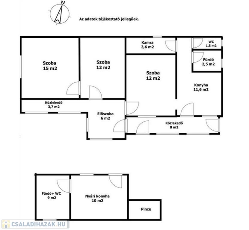 A telken található még egy melléképület is, amely jelenleg nyári konyhaként funkcionál, WC és fürdő kialakítással, valamint pincével.