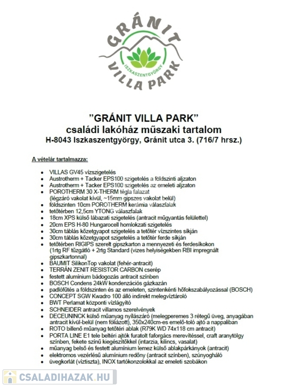 A Iszkaszentgyörgy-GRÁNIT Villapark, Székesfehérvártól csupán 5km-re, a Márványkert közelében található, 12 db önálló telken lévő 12 db önálló házzal rendelkezik, Házanként 152m2, 2 szint, saját telek (800m2- 925m2-ig), 20,5m2 terasz, minden ház 2 irányban tájolt, benapozott és átszellőztethető.