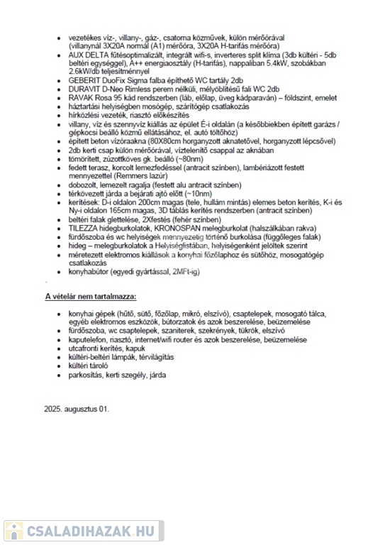 Az ingatlan összközműves, önálló helyrajzi számon lévő telekterületen az épület Porotherm 30 X-Therm téglából épült + 20cm szigeteléssel. A tető héjalása Terrán tetőcseréppel készült,. A fűtést szintenként szabályozható padlófűtés biztosítja. A melegvíz ellátás Heizer forróvíztároló biztosítja. A ház klimatizált , 5db beltéri egység található. A nyílászárók műanyag korszerű üvegezéssel, alumínium motoros redőnnyel ellátottak. A helyiségek burkolata, a beltéri ajtók, kapcsolók konnektorok… választhatók.