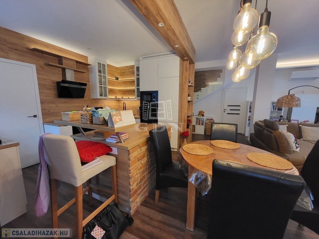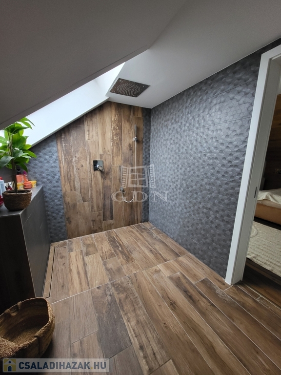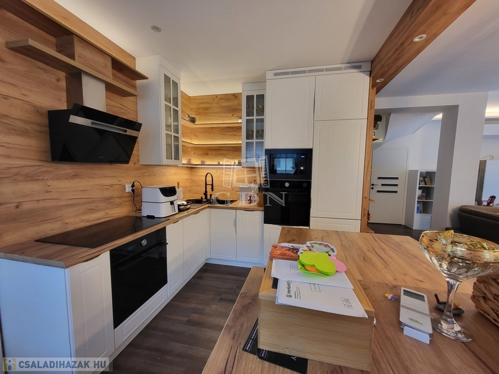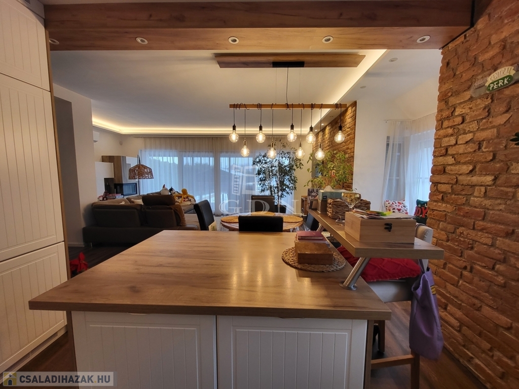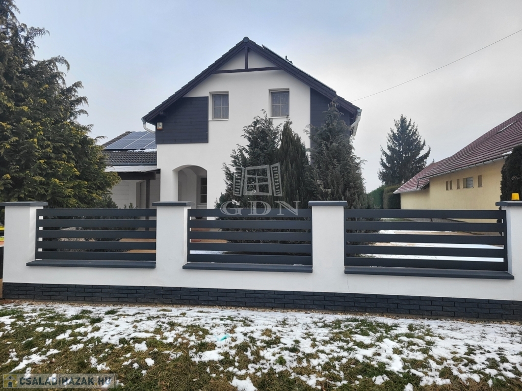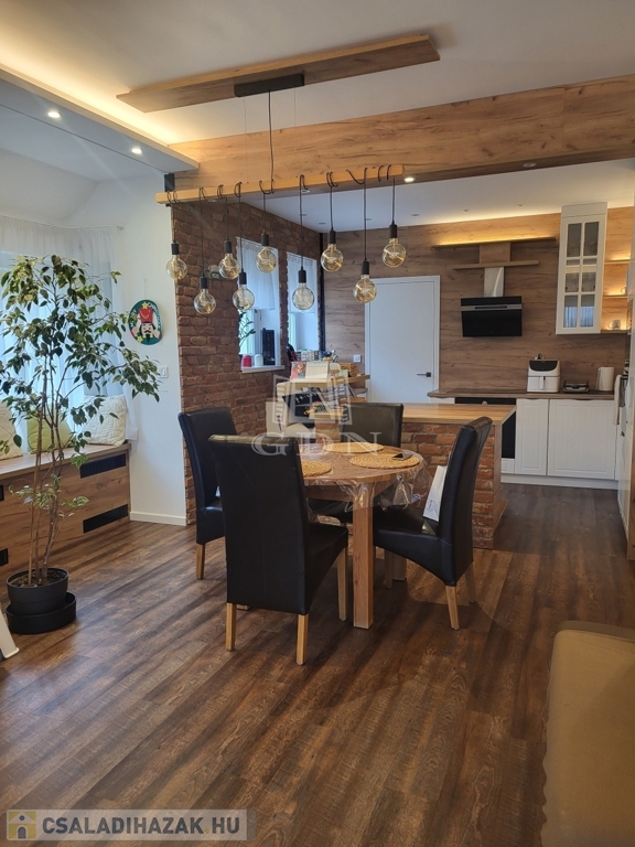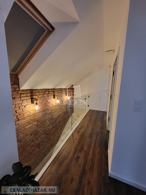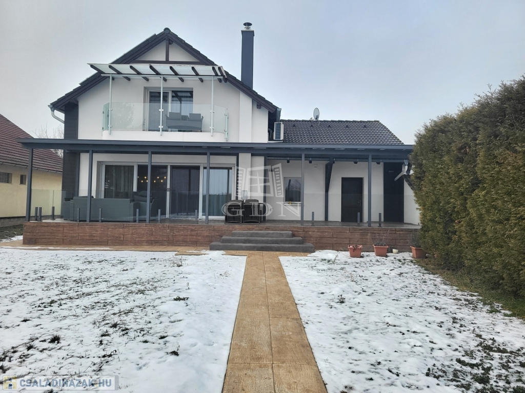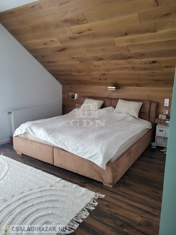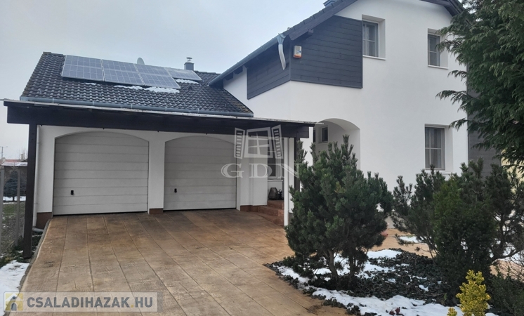 Ják átmenő forgalomtól mentes csendes utcájában eladó, páratlan adottságokkal rendelkező luxusingatlan. A lakóház mindkettő szintje átgondolt,praktikus, kényelmes kialakítású. Magas műszaki, technikai felszereltséggel átalakított ingatlan 2022-ben nyerte el kifogástalan esztétikai formáját. Tulajdonosai különös figyelmet fordítottak a harmonikus megjelenésre, a helyiségek egyenletes, kellemes fényviszonyainak biztosítására. Ennek érdekében hangulatos fali világítócsatornák, ledszalagok, álmennyezeti világítások, bútorok mögé épített világító felületek kaptak helyet. Négy rétegű üvegezéssel ellátott hatalmas tolóajtós felület biztosítja a természetes fényviszonyokat az ingatlan terasza felöl. Az erkélyajtó elektromos aluredőnnyel felszerelt. Közel 40 m2 -es terasz köti össze a házat az 1400 m2-es , szépen karbantartott kerttel. Elektromos hálózata 2x16 A, 1x40 Amper. A tetőn 23 db napelem található, 9.4 kw teljesítménnyel, invertellel. A dupla garázsban elektromos autó töltési lehetrőséggel. Az ingatlan fűtése Bosch kondenzációs kazánon kívül, modern cserépkályhával, központi hűtő -fűtő klímával történik, 5 db Daikini klíma került beépítésre. A ház négy hálószobával, három fürdővel rendelkezik. Amerikai konyhás nappalija 47 m2. Érdekessége a hangulatos ablakfülkéje izgalmas