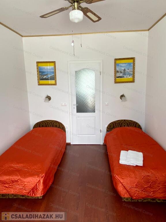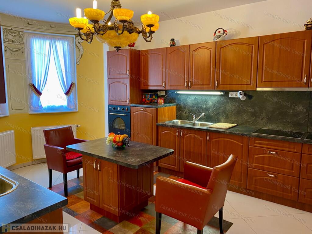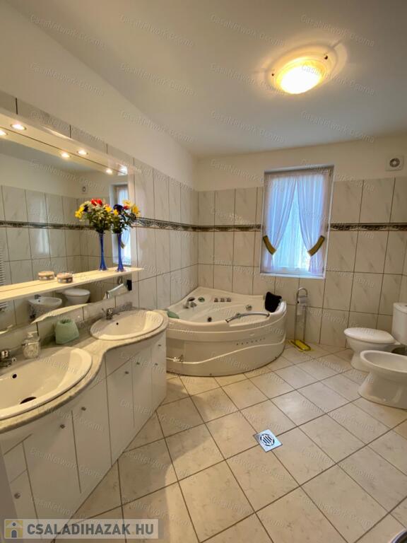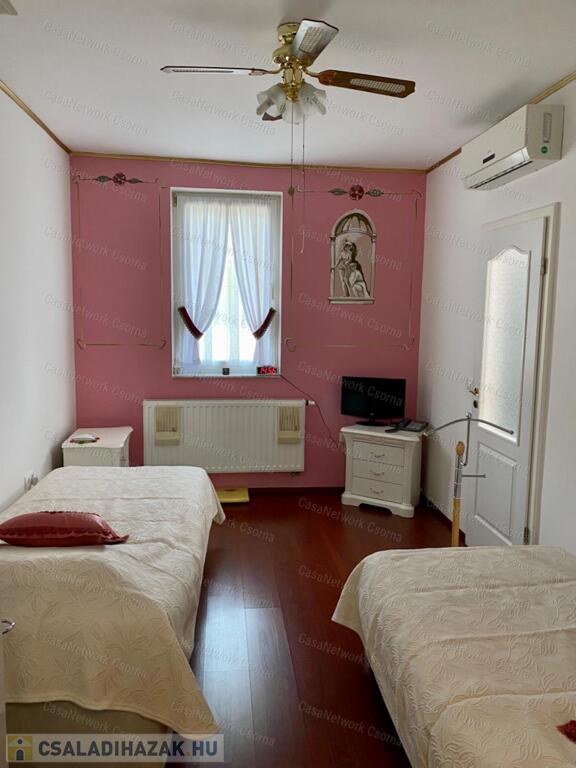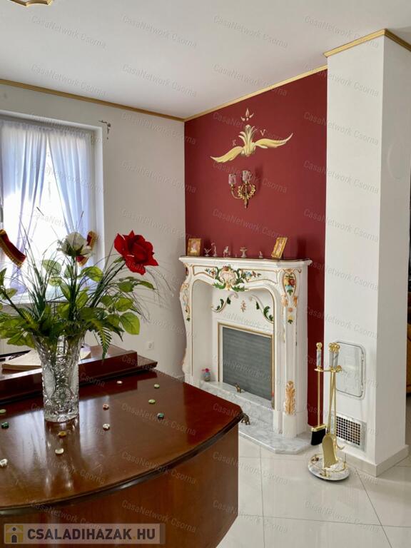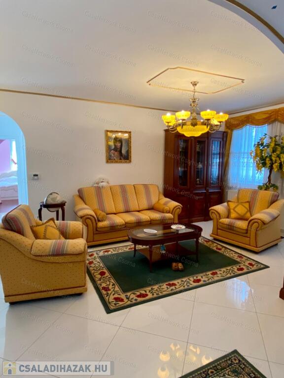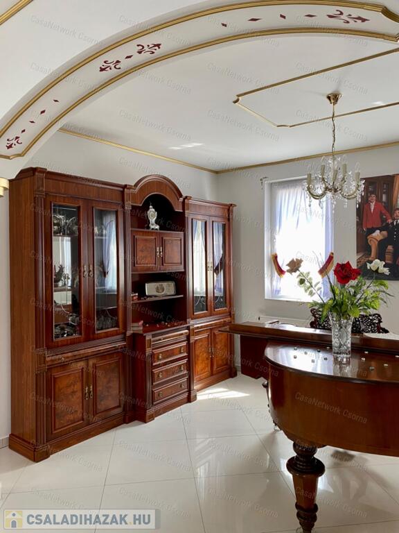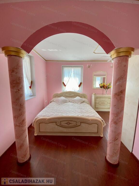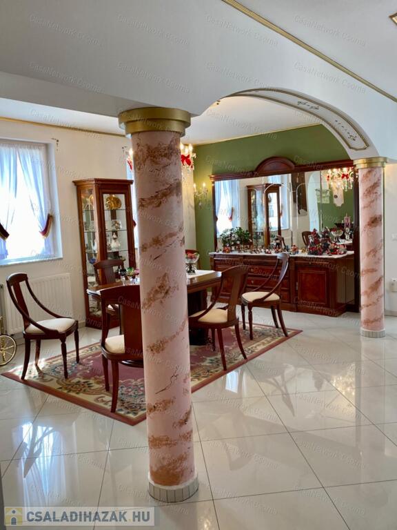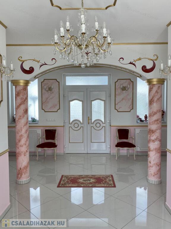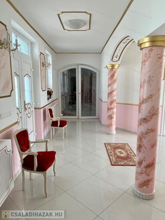 A kastély 3 csillagos amerikai stílusú kastélyszállóként üzemelt, melyhez 5 szoba tartozik, 20 fő elszállásolására van lehetőség. A szobák az udvarból nyílnak, így a saját lakóterülettől függetlenek. Ezek a szobák üzemelhetnek újra szállóként, vagy: tárolóként, hobbiszobaként, vendégszobaként. Mindegyik saját fürdővel rendelkezik. Felszereltsége: tv, hűtő, ventilátor, asztal, főzőlap.A lakótér szintén amerikai stílusban készült el, 3 hálószoba fő hálóval mindegyikéhez tartozik fürdőszoba,plafon ventilátor, többségében klíma. Továbbá amerikai stílusjegyek szintén felfedezhetőek az amerikai dupla konyhában, mind a bútorzat, mind a gépesítés duplán lett beszerelve. A kastélyban tovább sétálva találhatunk olvasó szobát, zene szobát ahol zongora található meg (1870-es évekből származó 100%fa zongora), gardróbot, nem maradhat el a társalgó, szalon sem. Továbbá felhívnám figyelmét az igényes, minőségi anyaghasználatra, amitől ez az ingatlan igazán értékes lesz: -réz kilincsek, márvány párkányok belül, réz kívül, kristály üveg ajtók, selyem függönyök,  24k aranyozott festések, oszlopok (14db) festése (művészek által festett, motívumok szintén), festmények, motívumok, alumínium ereszek, kettős hódfarkú kastélycserép, réz féltorony, alumínium zsalugáterek, mahagóni laminált padló, a korhű bútorok és csillárok Spanyolországból származnak, mindenből a legmodernebb a gépesítést figyelembe véve.Fűtésrendszere gázkazánnal és elektromos fűtéssel megoldott, két szárnyban külön-külön megtalálható a kazánház. A kastély erős alapokra épült, pénzt nem spórolva szakszerűen emelték meg a telek magasságát 1,8m-el. Az ingatlan tovább bővíthető,, megemelhető egy szinttel. Így az alapterület megduplázható, jelentősen pénztárca kímélőbben. Ipari áram a garázsba bevezetésre került. 2 fúrt kút ad vízellátást az antikolt szökőkutaknak, amelyek idényszerűen biztosítják a kellemes hangulatot az udvarban. A monolit vasbetonból  födém minden statikai követelményt kielégít. A 2 külön szárny tűzzáró ajtókkal lett elválasztva egymástól a nagyobb biztonság érdekében. 8cm szigetelést és nemesvakolatot kapott a ház kívülről. 3,5 férőhelyes garázsban több autó is kényelmesen elfér. A kastély mellet található közművesített 720m2-es építési telek szintén eladó a kastéllyal együtt +30 millió ft-ért. Amennyiben felkeltette figyelmét az ingatlan, vagy kérdése