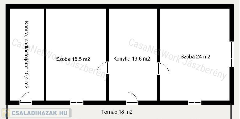 - kamra helyiség, illetve padlásfeljárat, 10,4 m2-es, járólapos, 18 m2-es tornác,