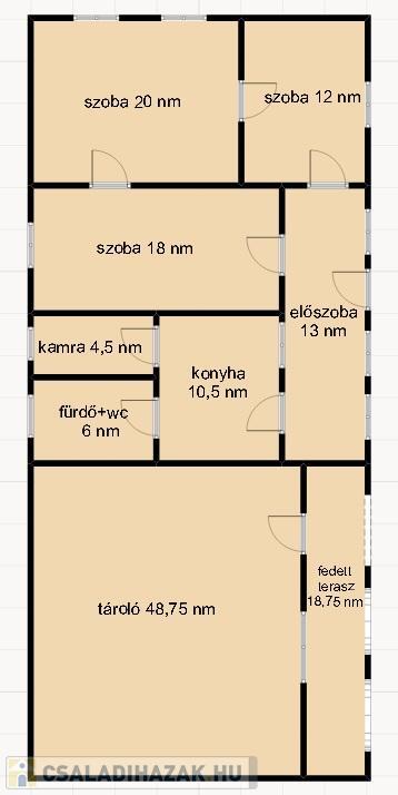 - Az ingatlanban található helyiségek: szobák (20 m2, 12 m2 és18 m2), konyha 10,5 m2, előszoba 13 m2, fürdő+wc 6 m2, kamra 4,5 m2, tároló 48,75 m2, fedett terasz 18,75 m2,