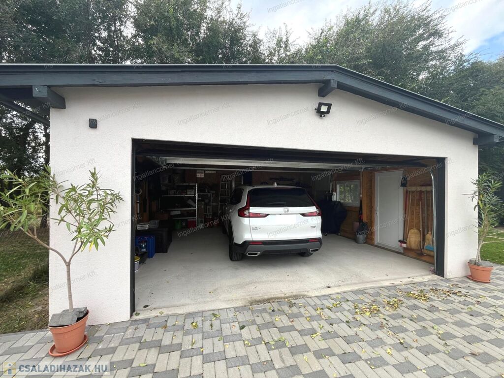 - KÜLSŐ TÁROLÓK: Egy 45 m2-es, szigetelt, elektromos HÖRMANN garázsajtóval felszerelt garázs ad helyet a kerti gépeknek, valamint egy, a kertből nyíló 4,46 m2-es TÁROLÓ is rendelkezésünkre áll.