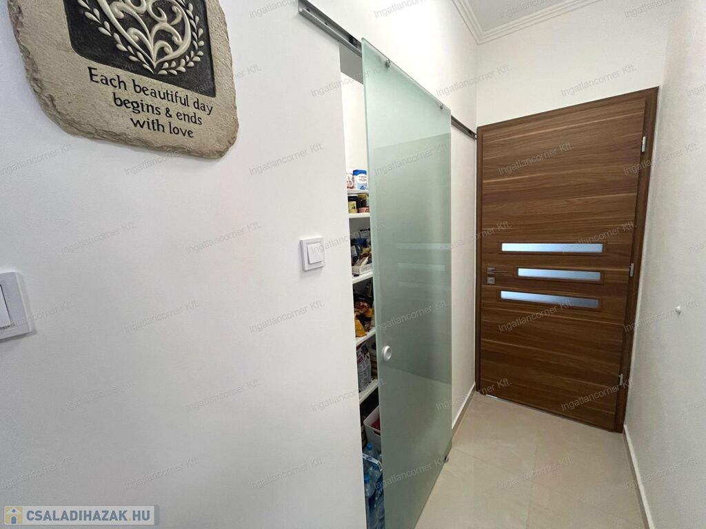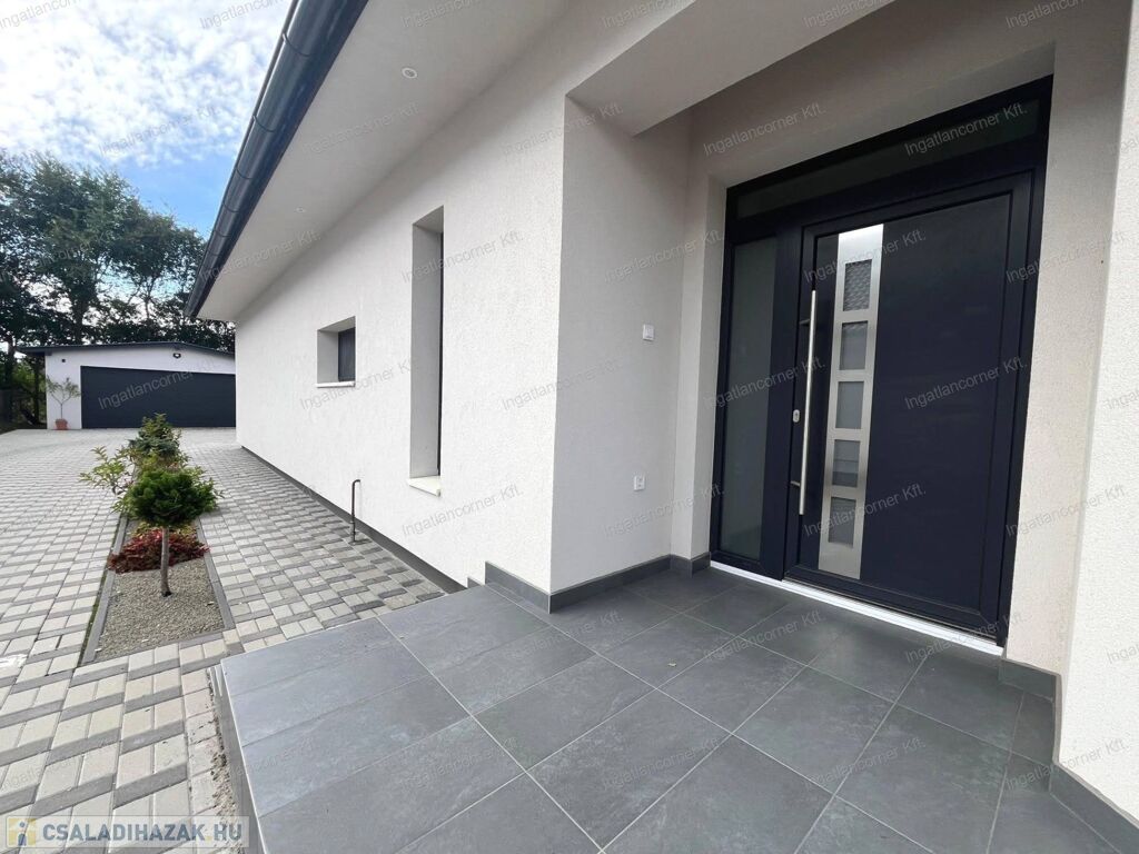 - NYÍLÁSZÁRÓK: Prémium antracit színű 3 rétegű üvegezéssel, 7 légkamrás német nyílászárók, melyek rovarhálóval és redőnnyel felszereltek. A teraszra való kijutást, nagyméretű ajtók biztosítják melyekre ALUMÍNIUM ELEKTROMOS REDŐNYÖK kerültek beépítésre, ugyanúgy a konyhai ablakra és a terasz felöli háló ajtajára is.