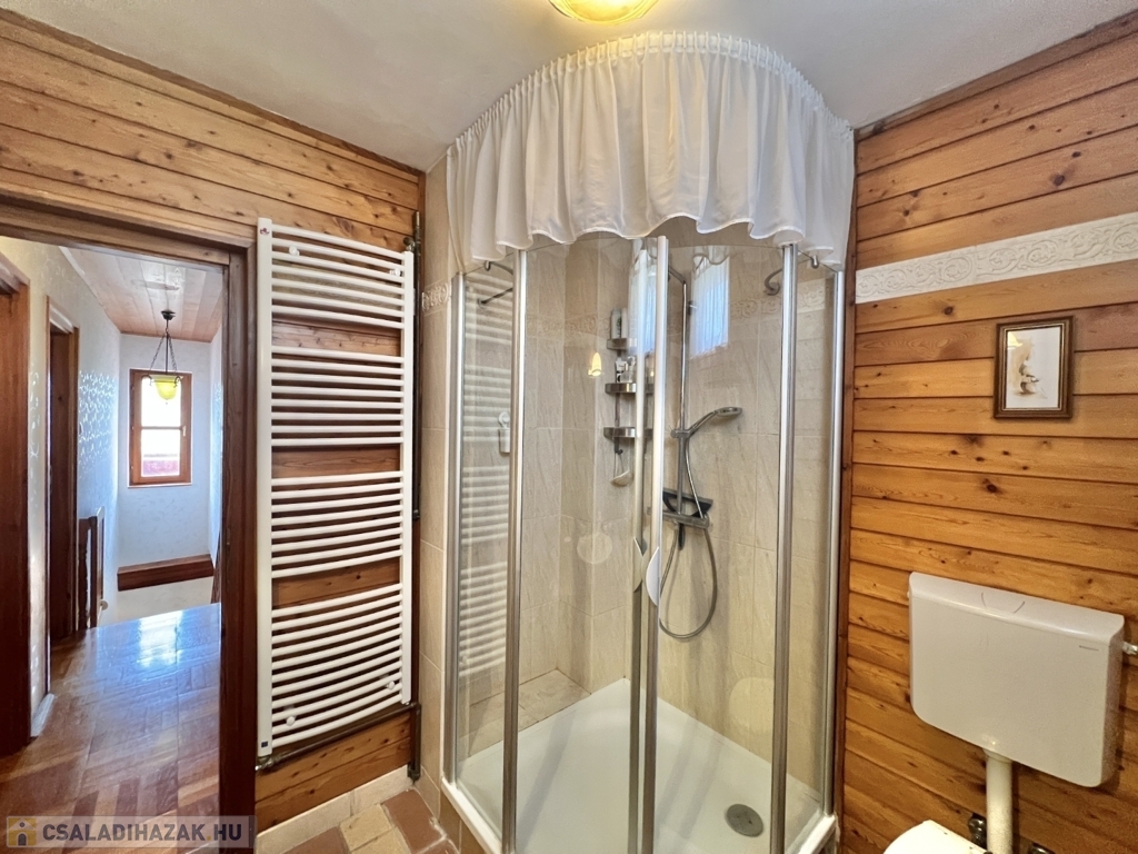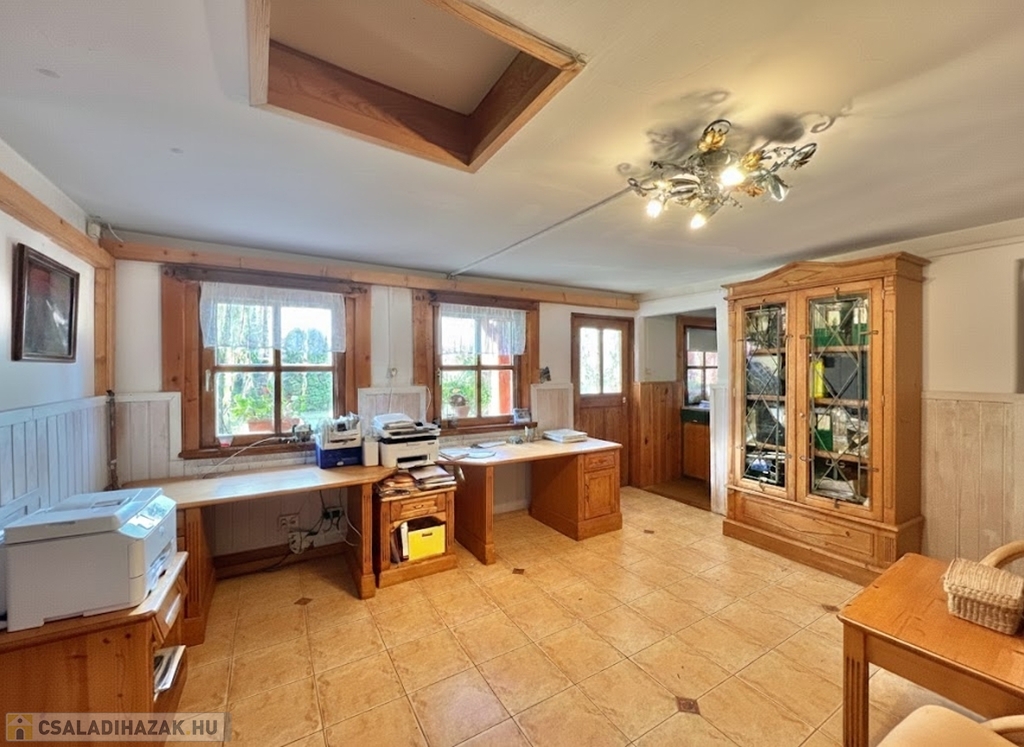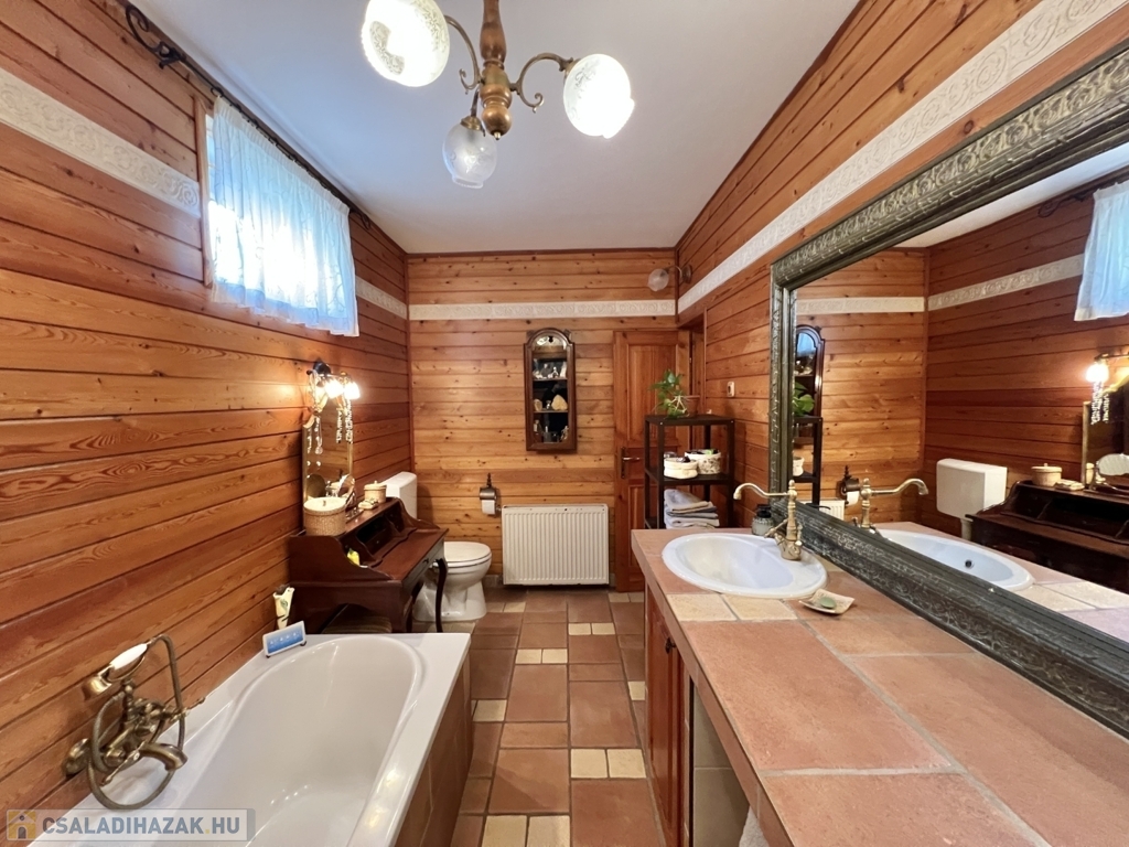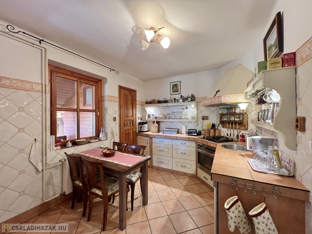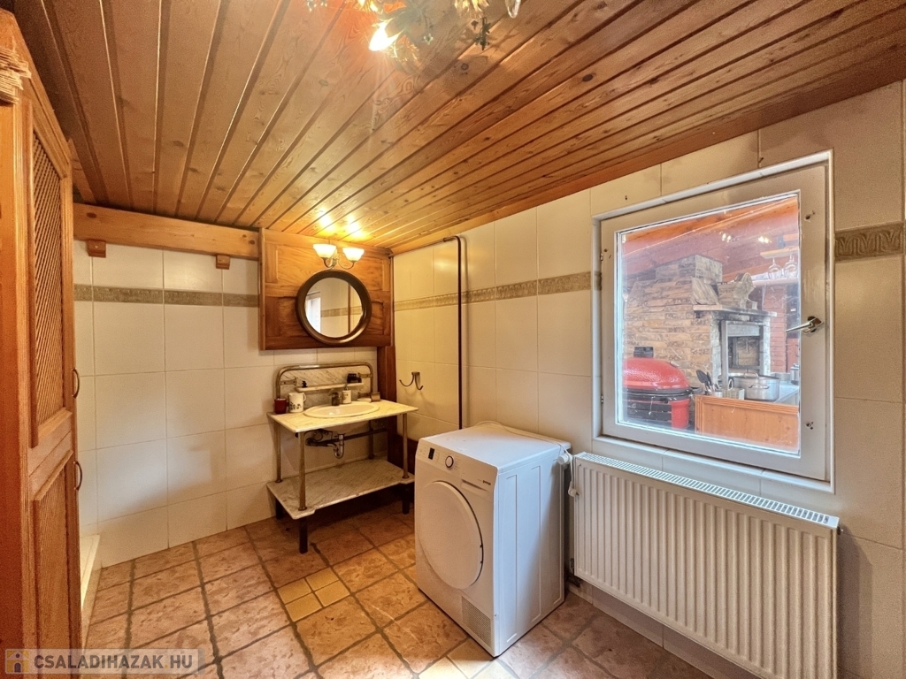 Kaposváron a Toponár városrészben - kifejezetten csendes környezetben lévő - rusztikus stílusban igényesen kialakított hangulatos 160 m2-es családi ház, különálló fedett grillterasszal, - külön lakrészként, vagy vállalkozásnak is használható - 1 szobás mellépülettel, és duplagarázzsal együtt eladó. A lakóház alsó szintjén tágas nappali, étkező, konyha-spájz, fürdőszoba-wc, előszoba, gardrób, továbbá belső udvar felé néző fedett terasz helyiségek kerültek kialakításra, valamint az épület alatt pince, kazánház helyiségek vannak. A tetőtérben 3 szoba-erkély, fürdőszoba-wc, továbbá gardrób helyiségek vannak, az épület fűtése gázközponti és vegyestüzelésű kazánnal, a melegvíz ellátása villanybojlerrel megoldott. A lakóház mögött az udvaron különálló - jelenleg irodának kialakított - melléképület található, amelyben 1 szoba, jelenleg tároló helyiség, wc, valamint szauna-mosókonyha-zuhanyzó vannak, a fűtése kályhával, gázközponti kazánnal -, valamint további igény esetén vegyestüzelésű kazánnal megoldott. Az udvarban két személyautónak alkalmas garázs, tároló-kazánház helyiségek kerültek kialakításra, illetve további gépkocsi, vagy egyéb dolgok tárolására egy 60 m2-es fedett szín is van. Telek: 2.275 m2