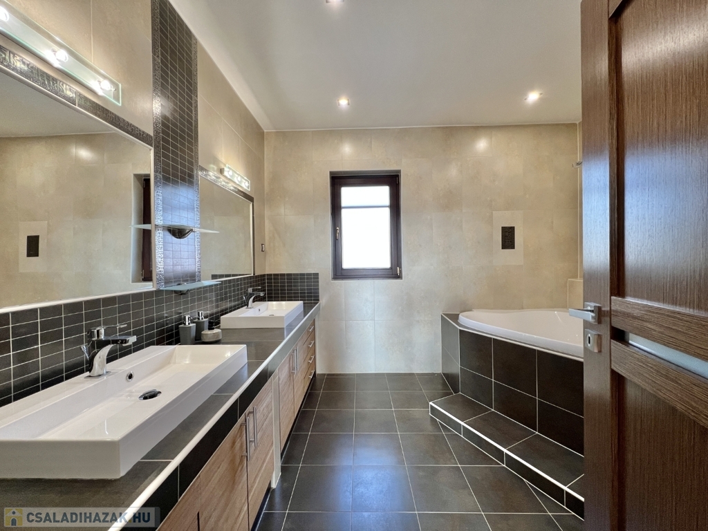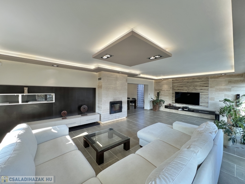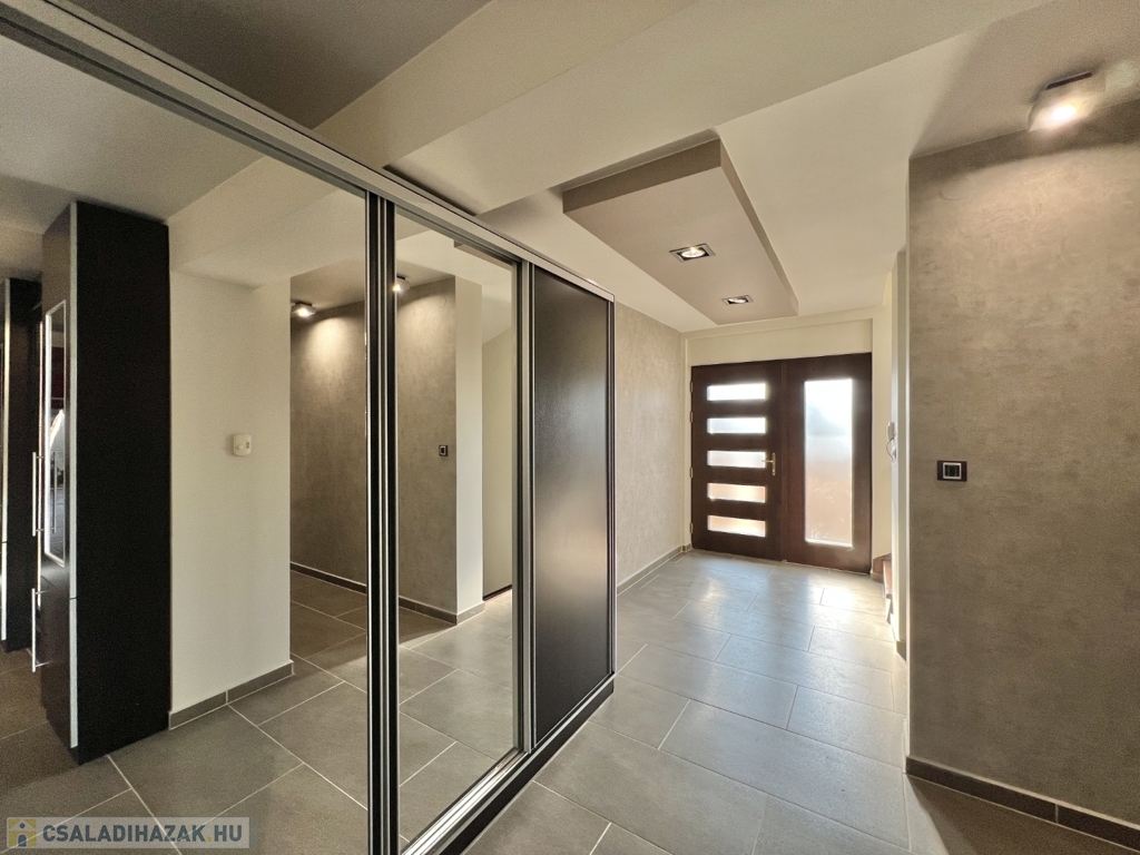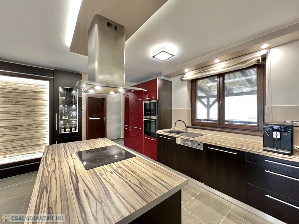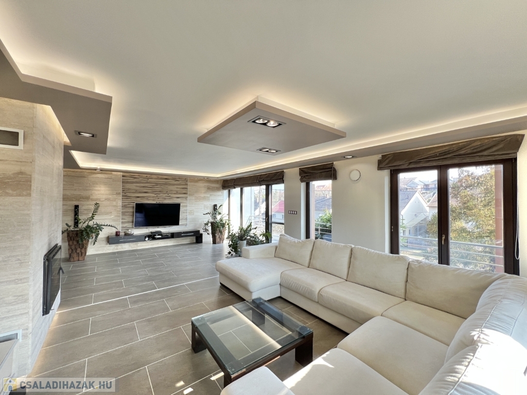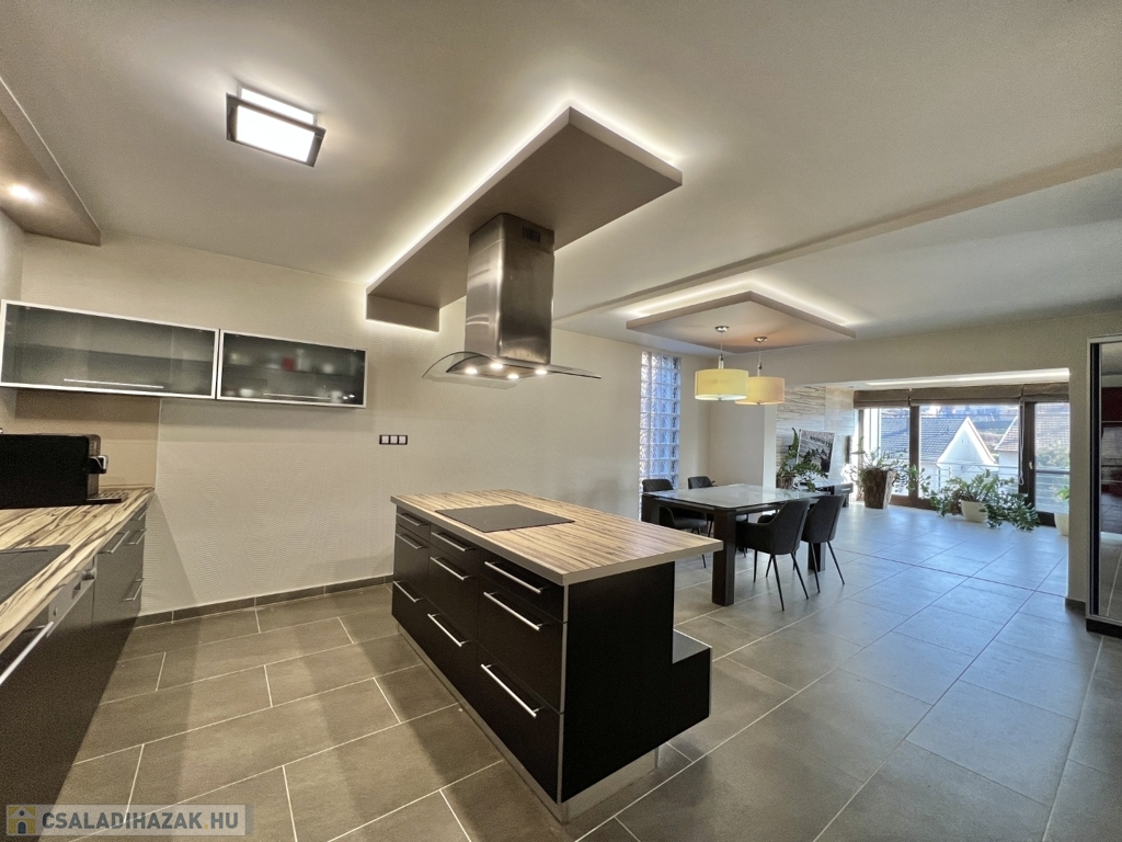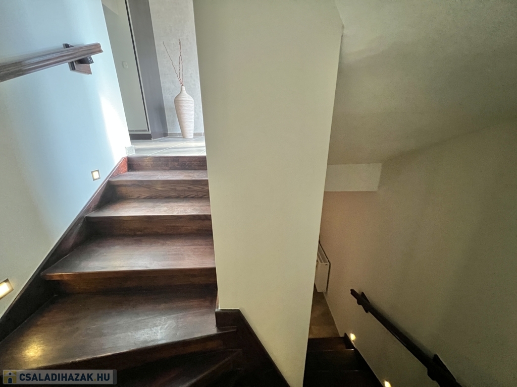 Kaposvár egyik kifejezetten kedvelt részén, a Kecelhegyen, exkluzív kialakítású 313 m2-es, háromszintes - akár két generáció számára is kialakítható - igényes családi ház eladó. A lakóház szuterénjében 2 személyautó részére alkalmas garázs, dolgozószobaként használt helyiség, hobbi-, vagy akár konditeremnek alkalmas-, zuhanyzó és wc helyiségek találhatóak. A földszinten nappali-étkező-konyha, fürdőszoba, wc kerültek kialakításra, az emeleten 3 tágas hálószoba, belső udvar felé néző fedett terasz, előtér, továbbá fürdőszoba helyiségek vannak. Az épület fűtése és melegvíz ellátása korszerű hőszivattyúval - padlófűtés és radiátorokkal - megoldott, a villany ellátást 7,5 kW-os napelemrendszer biztosítja, a szobákban trópusi fa parketta, egyéb helyiségekben kerámia járólap burkolat van, továbbá 3 rétegű fa nyílászárók lettek beépítésre, valamint riasztórendszer és légkondicionálók kerültek felszerelésre, illetve egyedi beépített szekrények és gardróbok is beszerelésre kerültek. A további kényelmet fokozza az udvaron található 8x3,5 méteres úszómedence is. Telek: 489 m2