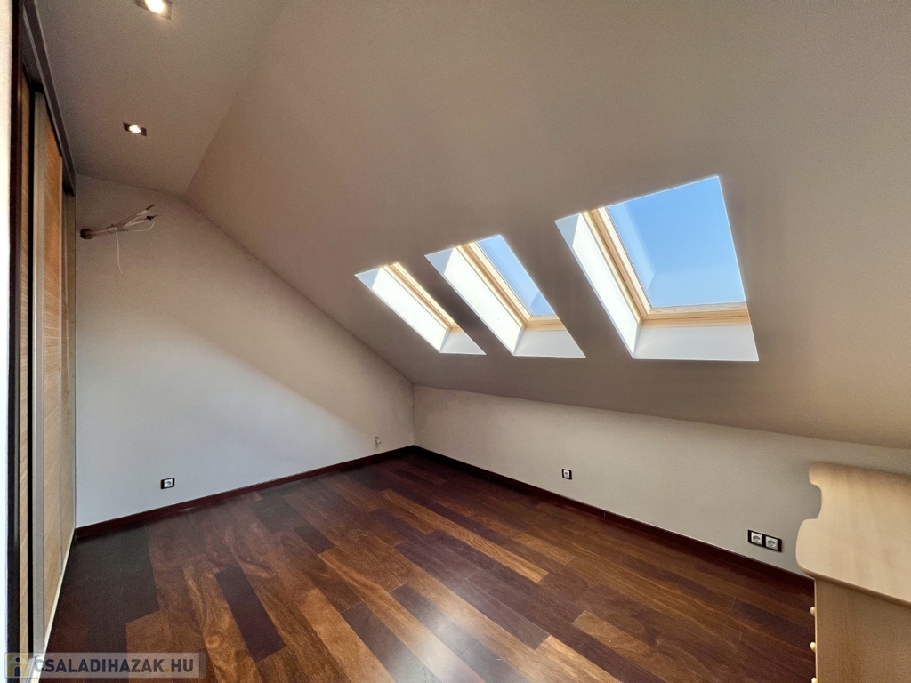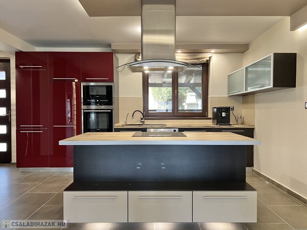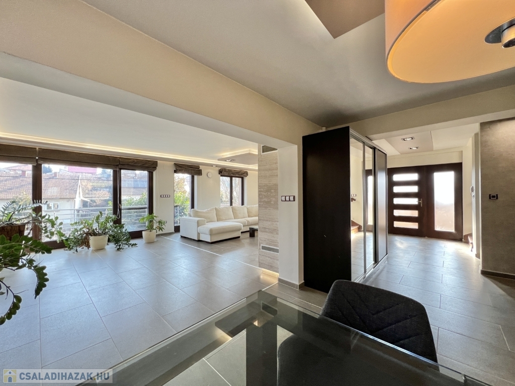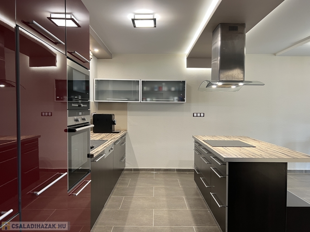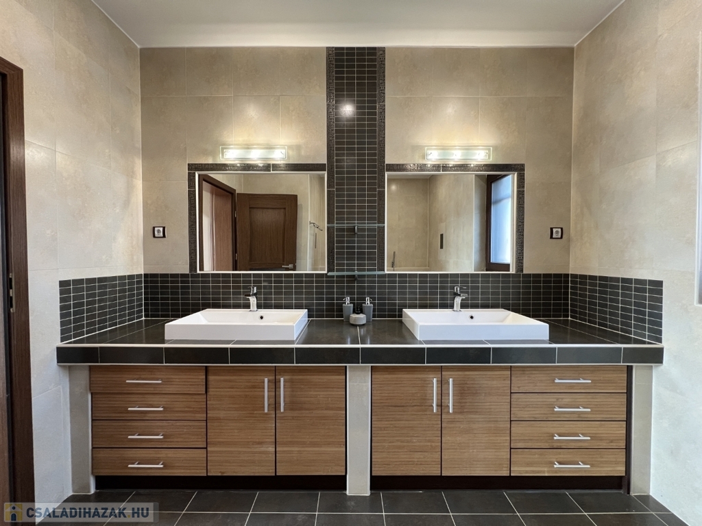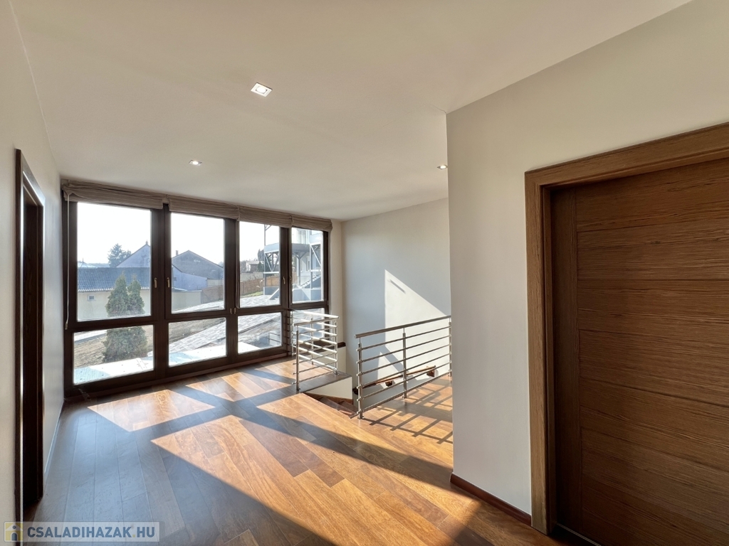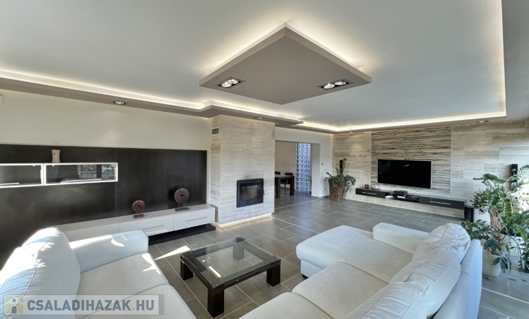 Kaposvár egyik kifejezetten kedvelt részén, a Kecelhegyen, exkluzív kialakítású 313 m2-es, háromszintes - akár két generáció számára is kialakítható - igényes családi ház eladó. A lakóház szuterénjében 2 személyautó részére alkalmas garázs, dolgozószobaként használt helyiség, hobbi-, vagy akár konditeremnek alkalmas-, zuhanyzó és wc helyiségek találhatóak. A földszinten nappali-étkező-konyha, fürdőszoba, wc kerültek kialakításra, az emeleten 3 tágas hálószoba, belső udvar felé néző fedett terasz, előtér, továbbá fürdőszoba helyiségek vannak. Az épület fűtése és melegvíz ellátása korszerű hőszivattyúval - padlófűtés és radiátorokkal - megoldott, a villany ellátást 7,5 kW-os napelemrendszer biztosítja, a szobákban trópusi fa parketta, egyéb helyiségekben kerámia járólap burkolat van, továbbá 3 rétegű fa nyílászárók lettek beépítésre, valamint riasztórendszer és légkondicionálók kerültek felszerelésre, illetve egyedi beépített szekrények és gardróbok is beszerelésre kerültek. A további kényelmet fokozza az udvaron található 8x3,5 méteres úszómedence is. Telek: 489 m2