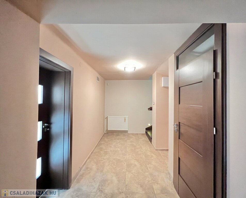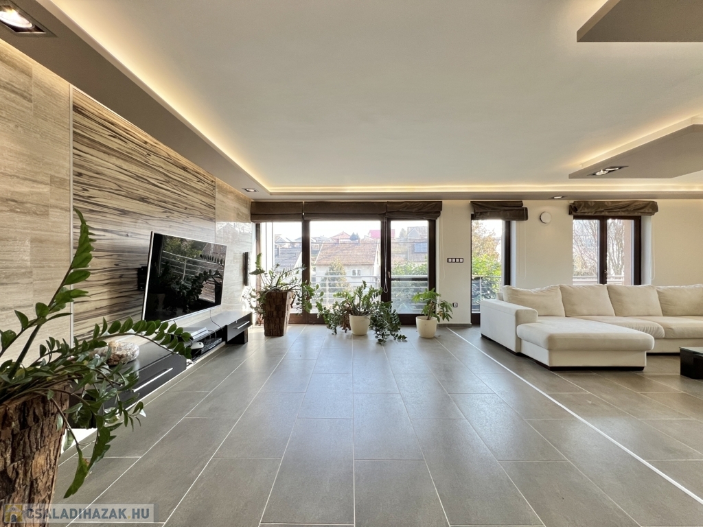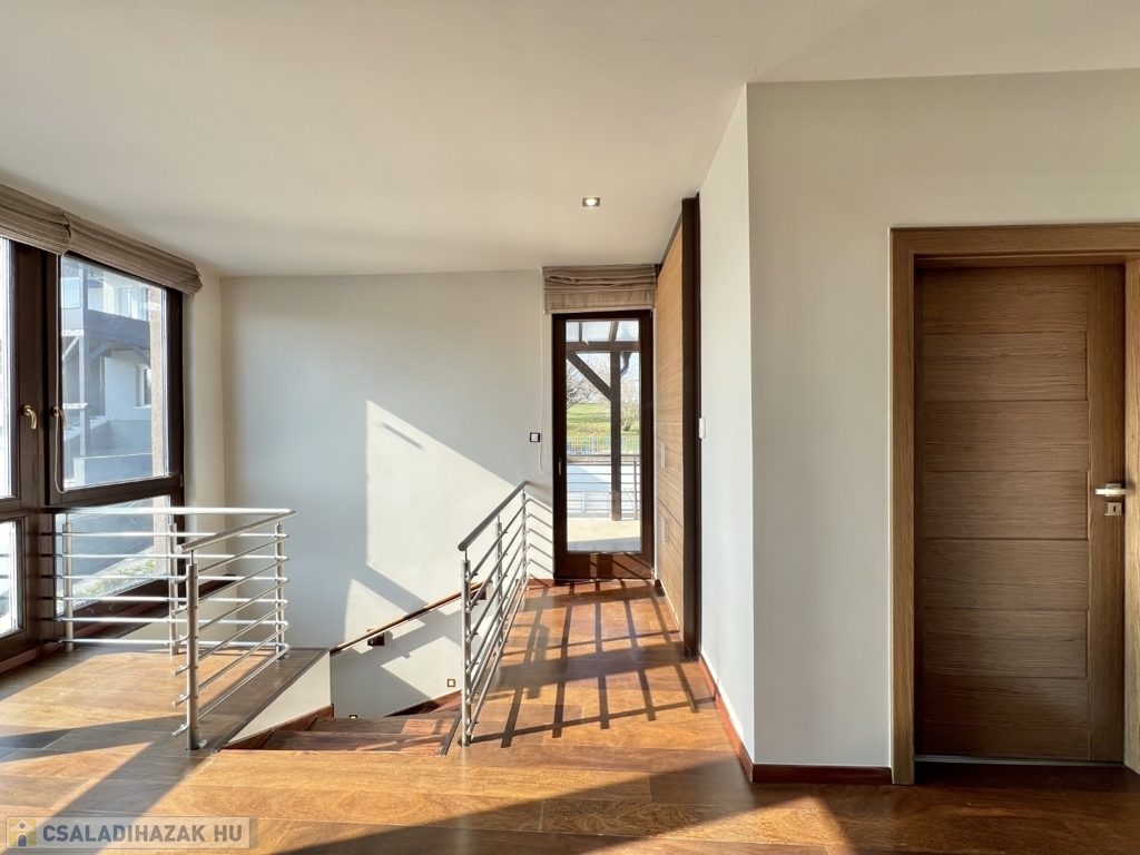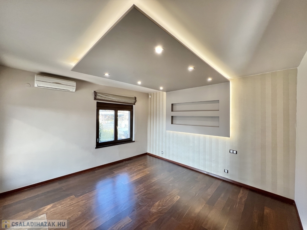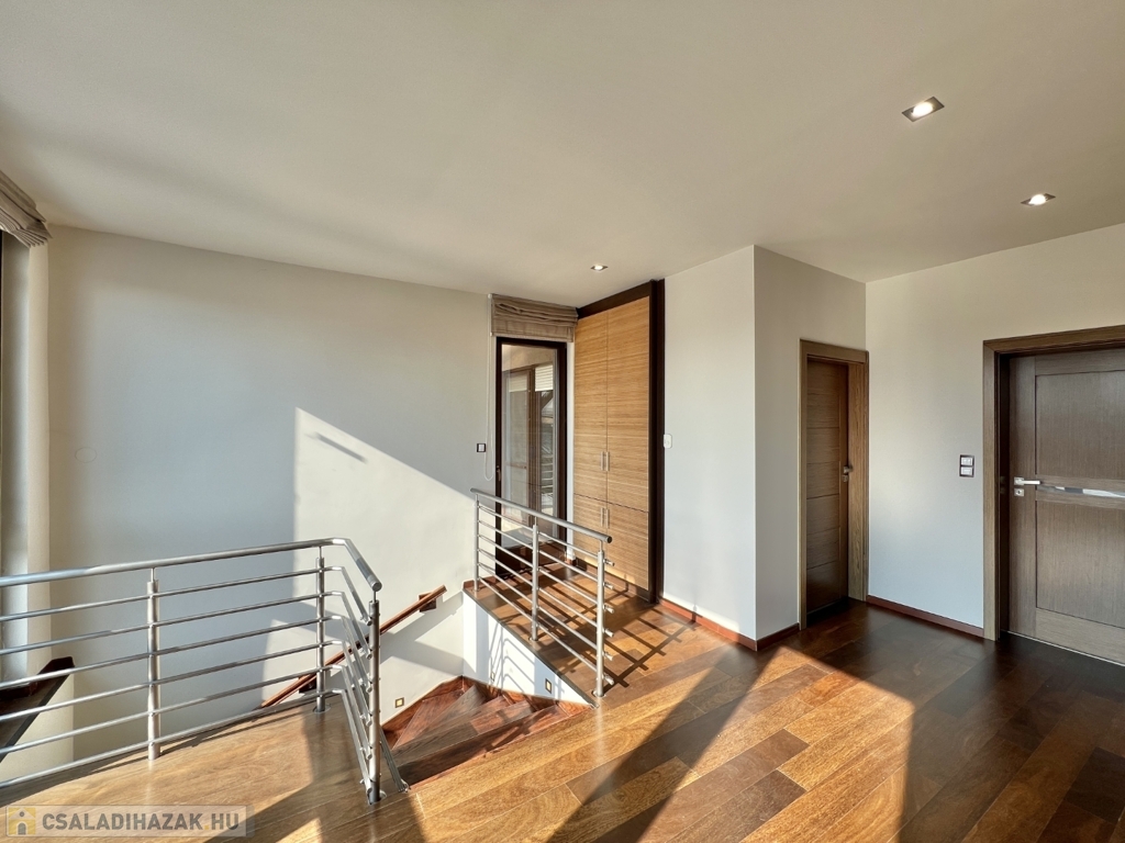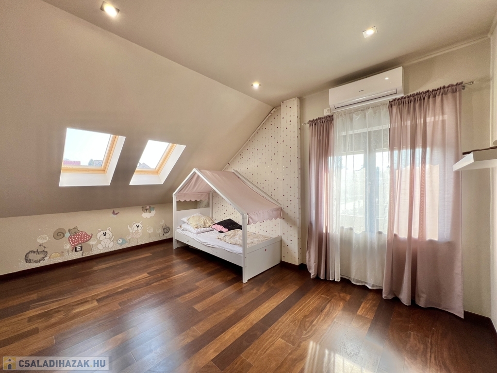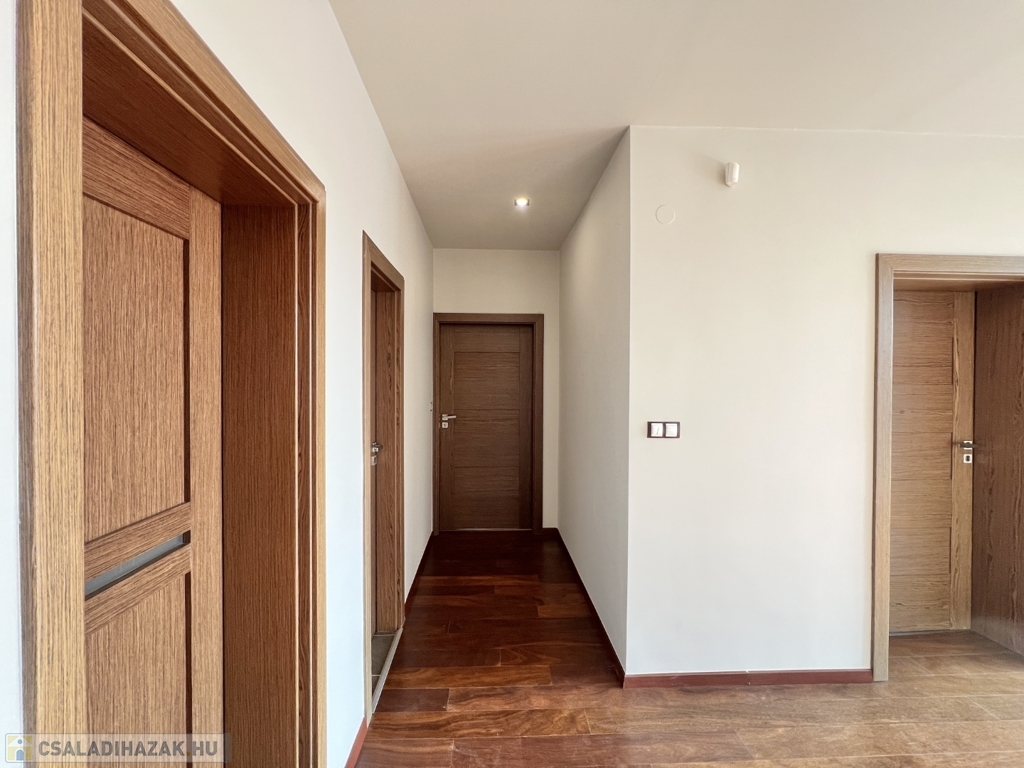 Kaposvár egyik kifejezetten kedvelt részén, a Kecelhegyen, exkluzív kialakítású 313 m2-es, háromszintes - akár két generáció számára is kialakítható - igényes családi ház eladó. A lakóház szuterénjében 2 személyautó részére alkalmas garázs, dolgozószobaként használt helyiség, hobbi-, vagy akár konditeremnek alkalmas-, zuhanyzó és wc helyiségek találhatóak. A földszinten nappali-étkező-konyha, fürdőszoba, wc kerültek kialakításra, az emeleten 3 tágas hálószoba, belső udvar felé néző fedett terasz, előtér, továbbá fürdőszoba helyiségek vannak. Az épület fűtése és melegvíz ellátása korszerű hőszivattyúval - padlófűtés és radiátorokkal - megoldott, a villany ellátást 7,5 kW-os napelemrendszer biztosítja, a szobákban trópusi fa parketta, egyéb helyiségekben kerámia járólap burkolat van, továbbá 3 rétegű fa nyílászárók lettek beépítésre, valamint riasztórendszer és légkondicionálók kerültek felszerelésre, illetve egyedi beépített szekrények és gardróbok is beszerelésre kerültek. A további kényelmet fokozza az udvaron található 8x3,5 méteres úszómedence is. Telek: 489 m2