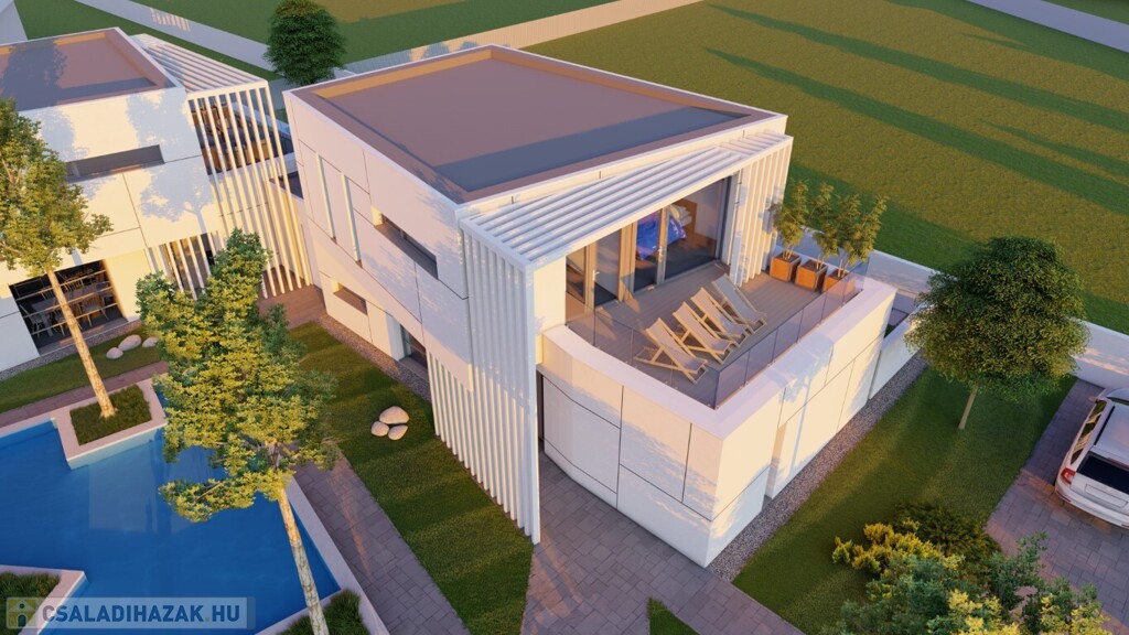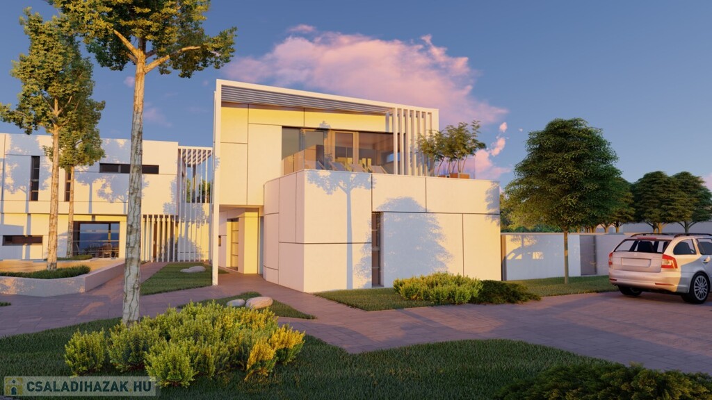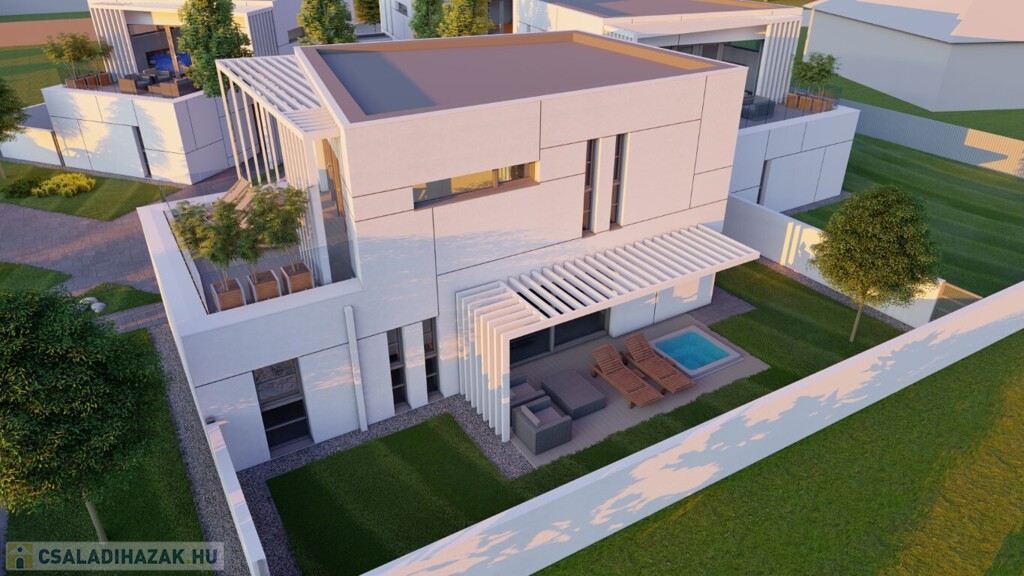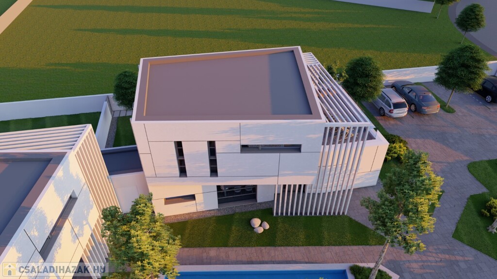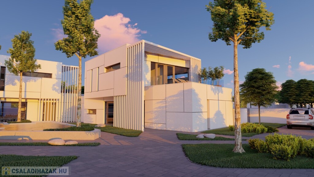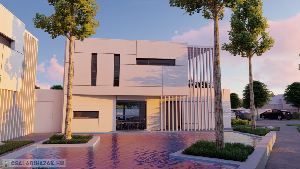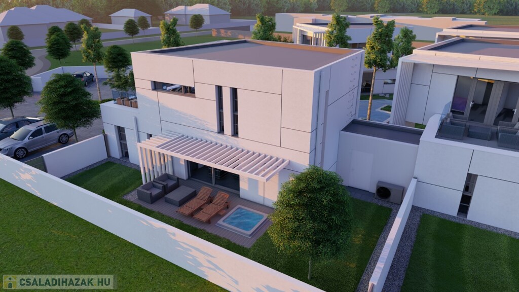 Kaposváron a Kisgát városrészben, a Reményik Sándor utcában, modern környezetben lévő, új építésű, exkluzív - magas minőségben kivitelezett, korszerű építőanyagokból épülő 4 lakásos Villaparkban - 125 m2-es kétszintes családi ház eladó. A lakóház földszintjén (76,8 m2) előszoba, nagy üvegportállal rendelkező tágas nappali - étkező, konyha, 1 szoba, gardrób, fürdőszoba-wc, további wc, gépészeti - tároló helyiségek kerültek kialakításra, továbbá tartozik hozzá egy 20,70 m2-es fedett, belső udvar felé néző terasz is - süllyesztett jakuzzival. Az épület felső szintjén (48,20 m2) előszoba, 2 szoba, fürdőszoba-wc és háztartási helyiségek, illetve 20,77 m2-es nyitott terasz vannak. A korszerű, modern energetikájú - alacsony rezsivel rendelkező - épület villany ellátása H tarifával megoldott, a fűtése LG típusú hőszivattyúval kerül kivitelezésre, továbbá fan-coil rendszer biztosítja a helyiségek fűtését és hűtését. Távirányítással működő zsaluziák lesznek felszerelve, illetve prémium minőségű szaniterek és szerelvények, illetve csapok - Wellis, illetve HansGrohe - kerülnek beépítésre. Az igényesen kialakított udvaron tartozik a lakáshoz 1 db fedett gépkocsibeálló és további 1 db kocsibeálló. Az épület teljes kivitelezését - és várható 2026. III. negyedévben történő átadását - követően a - komoly referenciákkal rendelkező - beruházó végzi majd a Villapark közös költséggel járó üzemeltetését is. A lakáshoz tartozó önálló udvar mérete: 75,55 m2