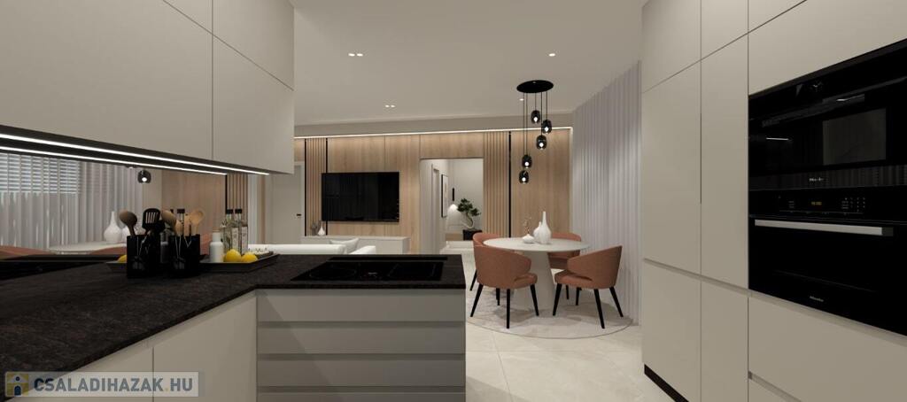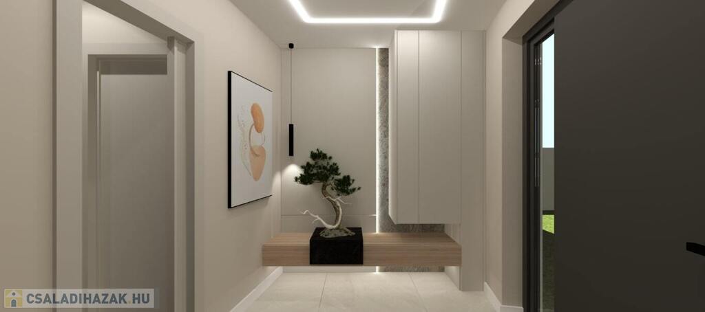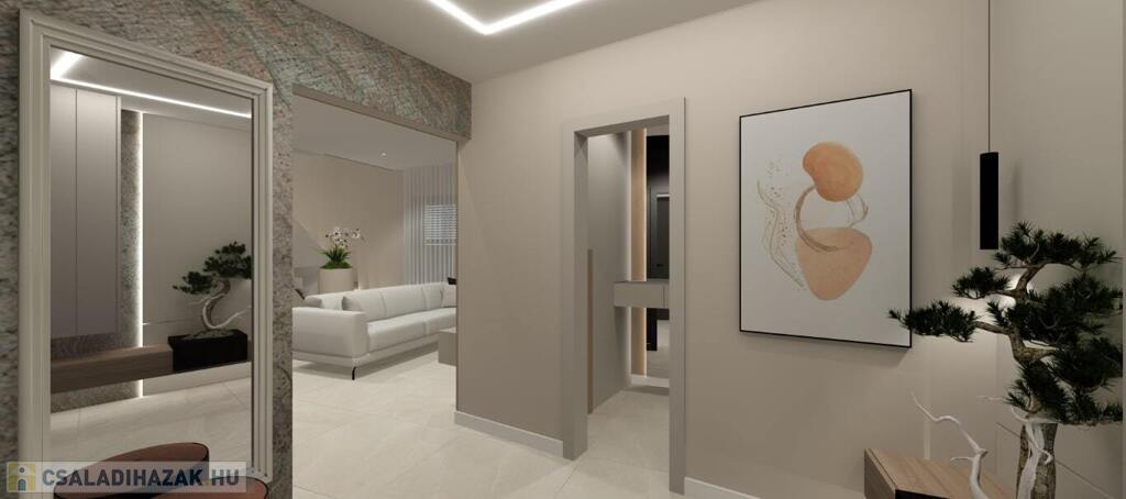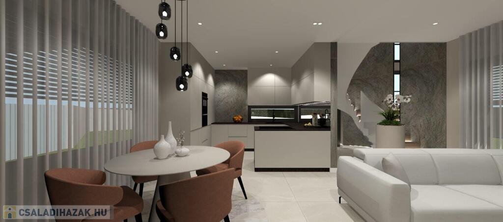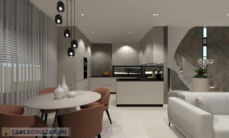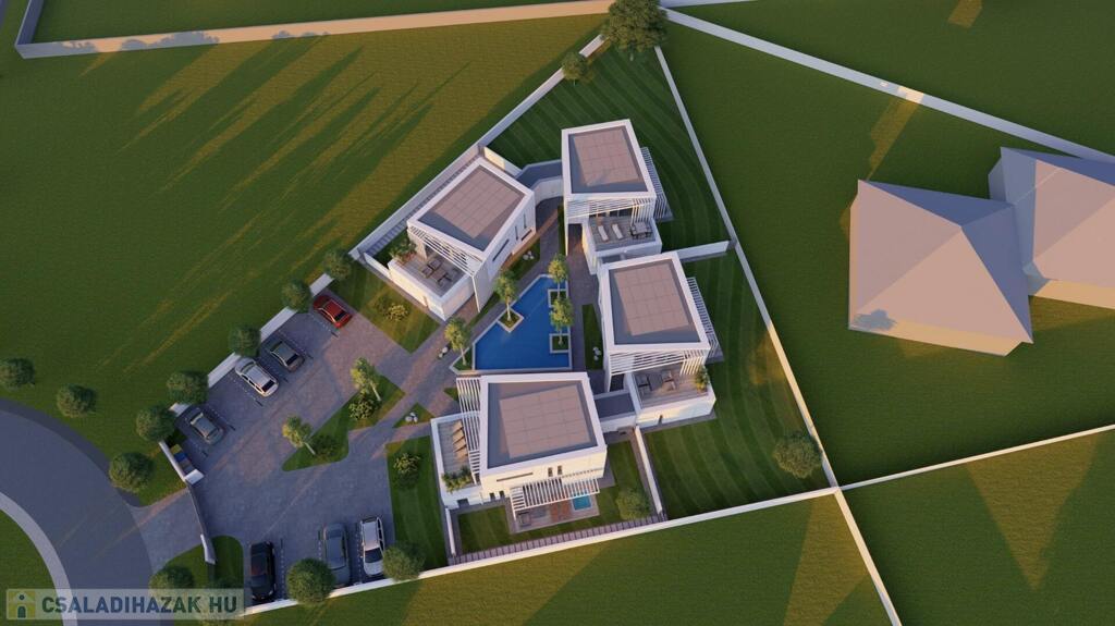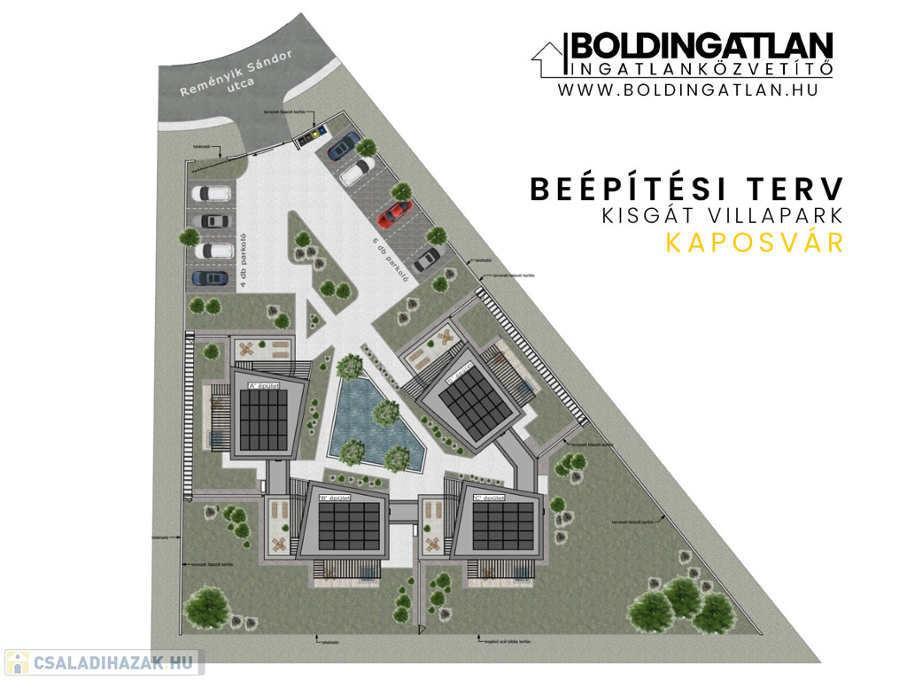 Kaposváron a Kisgát városrészben, a Reményik Sándor utcában, modern környezetben lévő, új építésű, exkluzív - magas minőségben kivitelezett, korszerű építőanyagokból épülő 4 lakásos Villaparkban - 125 m2-es kétszintes családi ház eladó. A lakóház földszintjén (76,8 m2) előszoba, nagy üvegportállal rendelkező tágas nappali - étkező, konyha, 1 szoba, gardrób, fürdőszoba-wc, további wc, gépészeti - tároló helyiségek kerültek kialakításra, továbbá tartozik hozzá egy 20,70 m2-es fedett, belső udvar felé néző terasz is - süllyesztett jakuzzival. Az épület felső szintjén (48,20 m2) előszoba, 2 szoba, fürdőszoba-wc és háztartási helyiségek, illetve 20,77 m2-es nyitott terasz vannak. A korszerű, modern energetikájú - alacsony rezsivel rendelkező - épület villany ellátása H tarifával megoldott, a fűtése LG típusú hőszivattyúval kerül kivitelezésre, továbbá fan-coil rendszer biztosítja a helyiségek fűtését és hűtését. Távirányítással működő zsaluziák lesznek felszerelve, illetve prémium minőségű szaniterek és szerelvények, illetve csapok - Wellis, illetve HansGrohe - kerülnek beépítésre. Az igényesen kialakított udvaron tartozik a lakáshoz 1 db fedett gépkocsibeálló és további 1 db kocsibeálló. Az épület teljes kivitelezését - és várható 2026. III. negyedévben történő átadását - követően a - komoly referenciákkal rendelkező - beruházó végzi majd a Villapark közös költséggel járó üzemeltetését is. A lakáshoz tartozó önálló udvar mérete: 75,55 m2