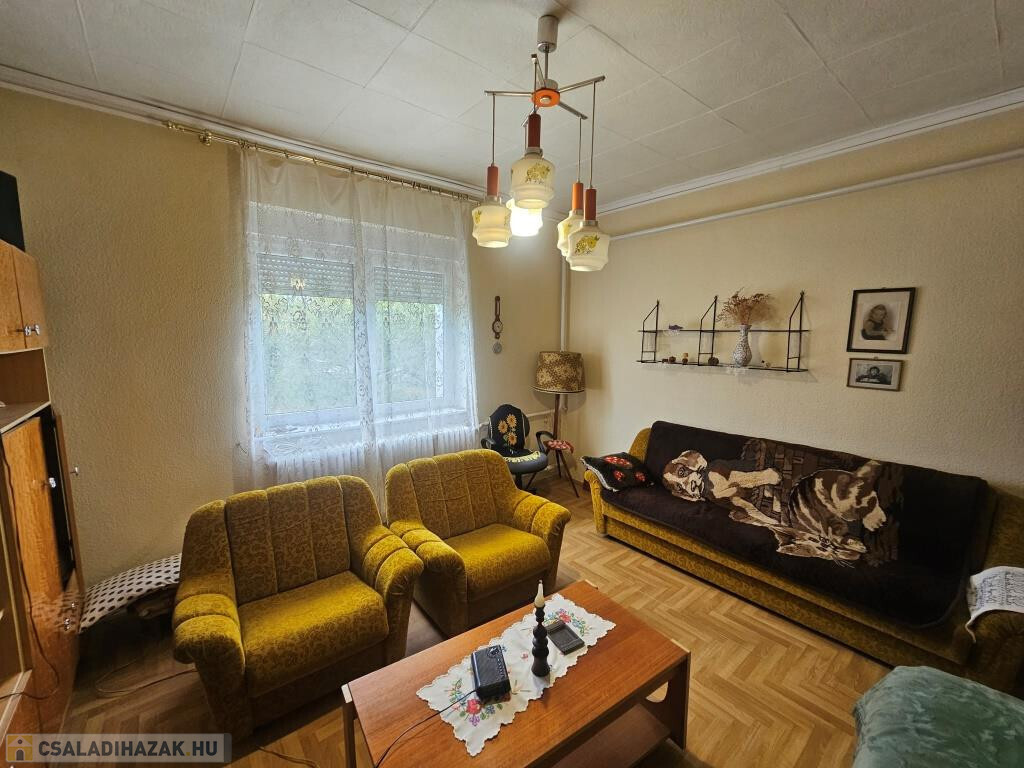 Kaposváron, a Nyugativánfa utcában kínáljuk megvételre ezt a kétszoba hallos, jó állapotú családi házat. Lakóterülete 63 m2, amihez még hozzáadódik a kazánház és a teraszból leválasztott előtér. Ezen kívül több, tárolóként, műhelyként használható melléképület, pince és garázs áll rendelkezésre. A ház bejárata hátul, a teraszról vezet be az előtéren keresztül a hallba. Innen nyílik szemben egymás mellett a két tágas szoba, balra az étkezős konyha, jobbra a fürdő, és egy kis közlekedő a padlásfeljáróval, majd a WC. Központi fűtés van, ami kétféle módon is működtethető: vegyes tüzelésű kazánnal, vagy gázkazánnal. Külső szigetelést is kapott a ház, és az ablakok zöme új, műanyag keretes. Nem szokványos, hogy a ház az utcafronttól bőven beljebb épült, ezért a telek nagyobb része a ház előtt helyezkedik el. Ez a terület egészen enyhén emelkedik a ház felé, igazán szépen gondozott. Találunk itt gyümölcsfákat és füves, virágos részeket. A ház mögött viszont meredekebb, teraszos kialakítású a terep. Lent, az utcához közel egy árok is keresztülfolyik a területen. A telek 1476 m2. A környék nyugodt, családi házas övezet, a ház és a kert hangulatos, barátságos.