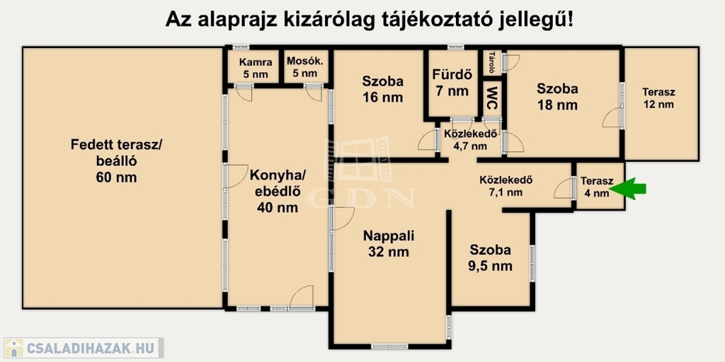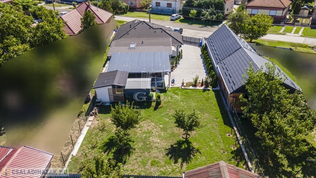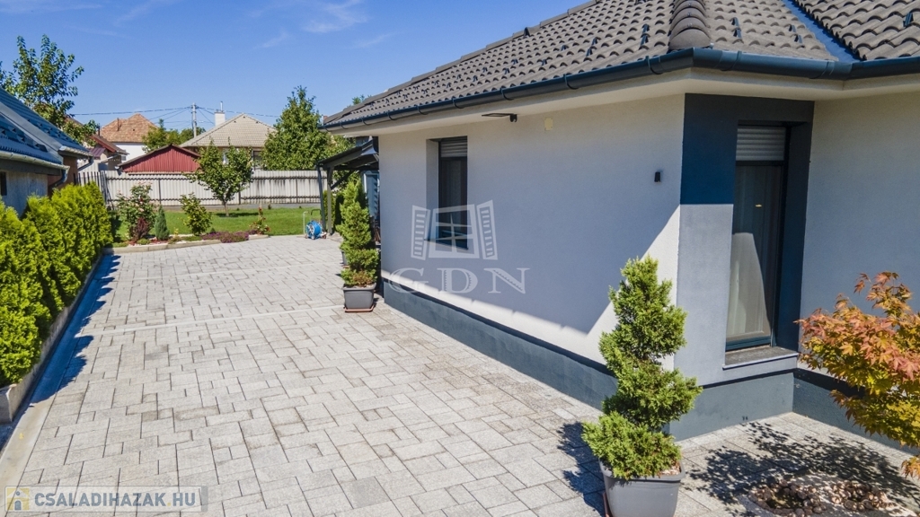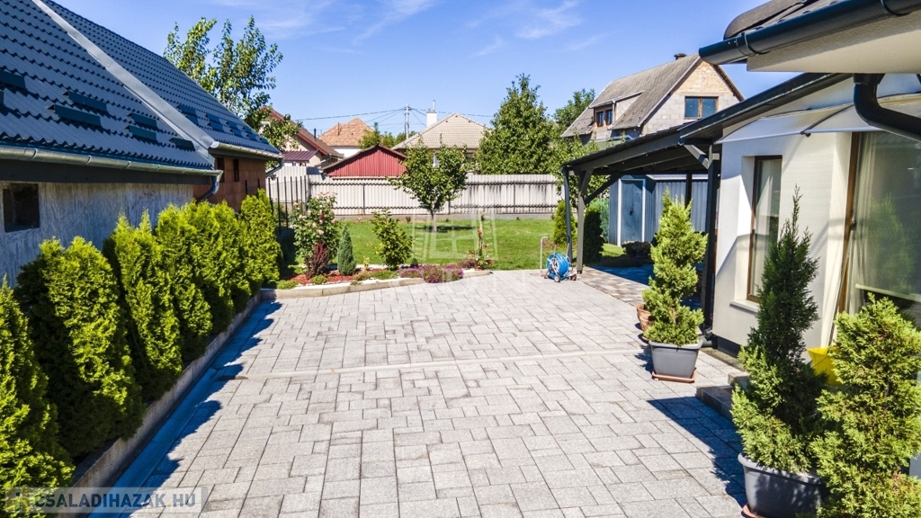 Az udvar részét képezi a 60 nm-es fedett terasz, mely egyben kocsibeálló is, valamint egy kinti zárt grillező és 3 tároló helyiség.
