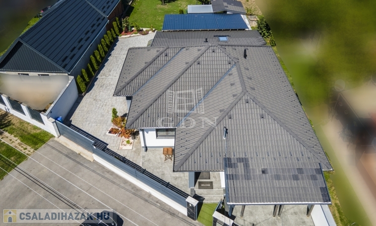 Az udvar részét képezi a 60 nm-es fedett terasz, mely egyben kocsibeálló is, valamint egy kinti zárt grillező és 3 tároló helyiség.