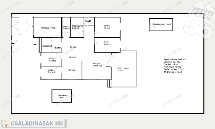 -Melléképület: 20 m2:csatorna, víz és villany kiépítve, ideális tároláshoz vagy hobbihelyiségnek