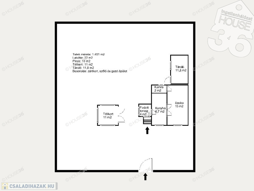 - Lakótér: 22 m2 (1 szoba, konyha, kamra)+ 4 m2 fedett terasz