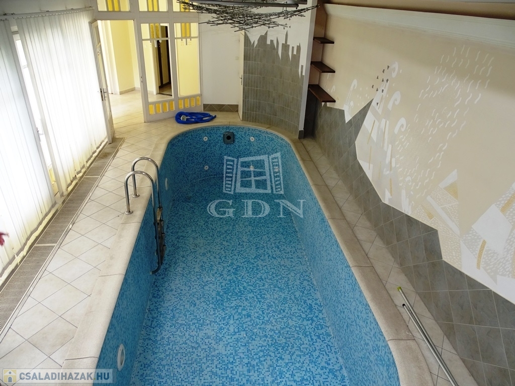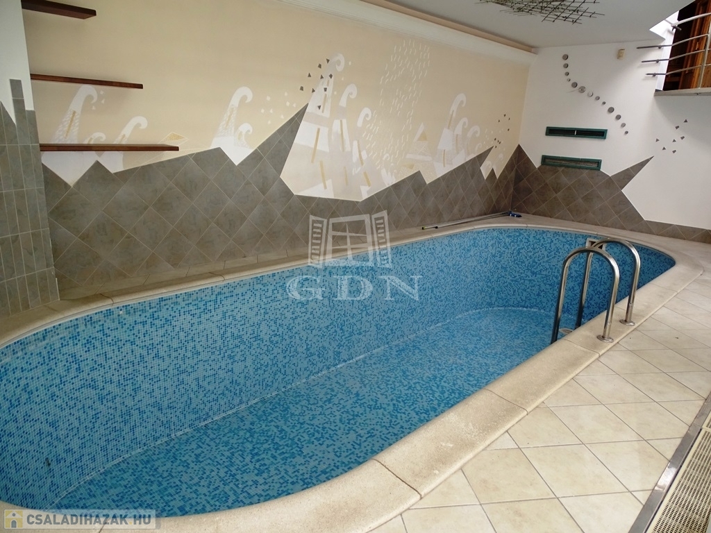 Az épületben a hatalmas, terasszal összenyitható, kandallós nappali, és a világos konyha mellett 6 szoba és 3 fürdőszoba található, exkluzivitását a különleges, A. VARGA IMRE festőművész által díszített beltéri medence adja, mellette egy nagyméretű szaunával.