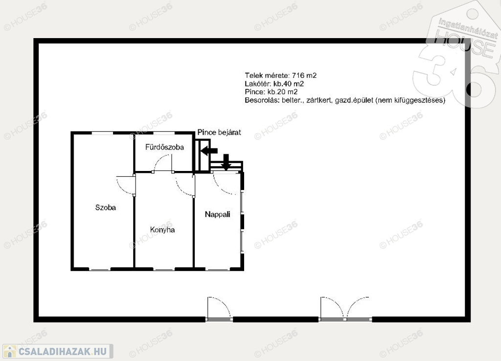 - Lakótér: br.40 m2 : nappali, konyha, fürdőszoba, hálószoba