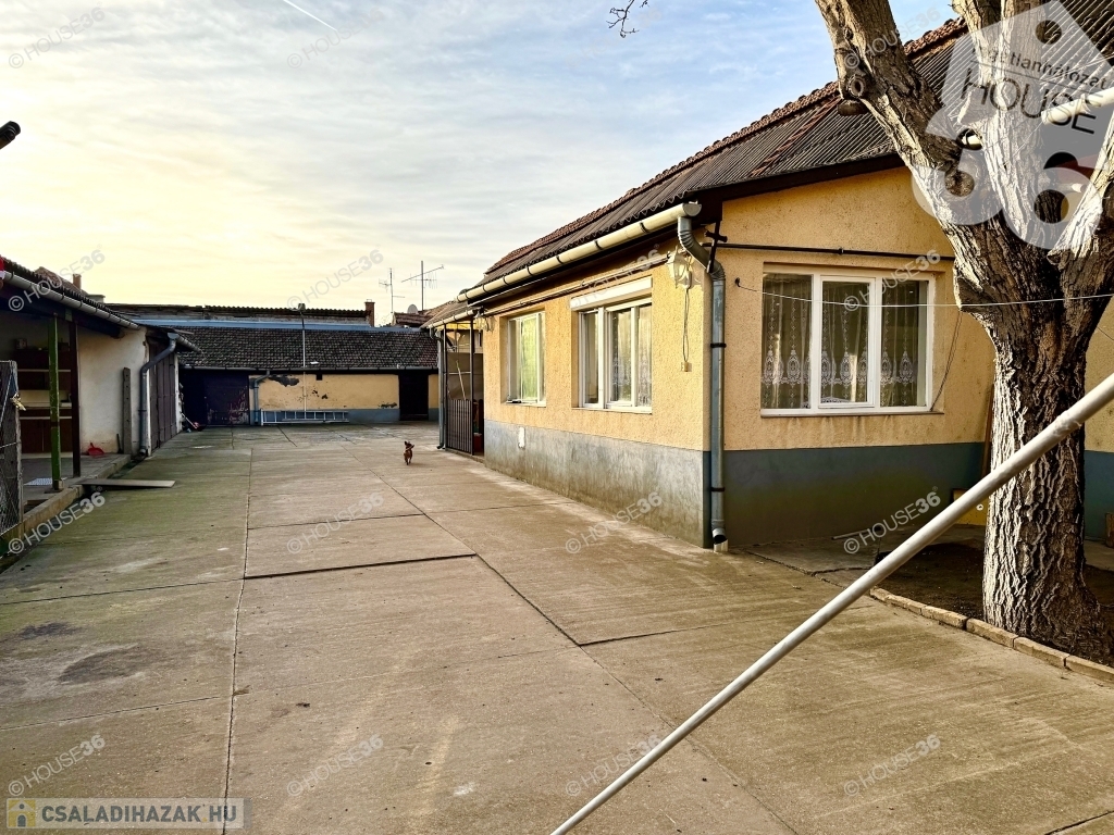 Kecskemét központjához közel, vegyes falazatú, beton alapra épült családi ház, nyári konyhával, melléképületekkel, fás kamrával és dupla garázzsal.
