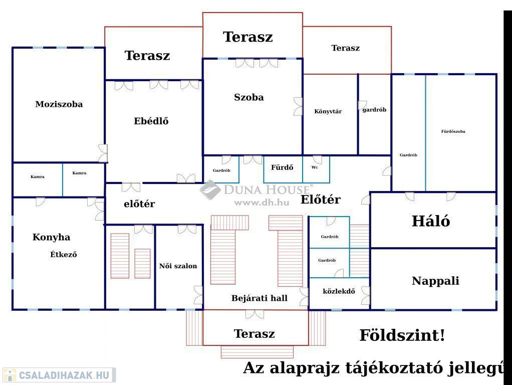 - A fő szintje a földszint, mely 586 nm alapterületű. Itt kerültek elhelyezésre a fő funkciók és az őket kiszolgáló egységek illetve egy önálló lakrész.