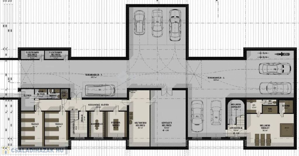 Az épület alatt 638 nm pince található, melyet széles, fűtőszálas lejárón lehet megközelíteni. Nyolc autó beállására van lehetőség.