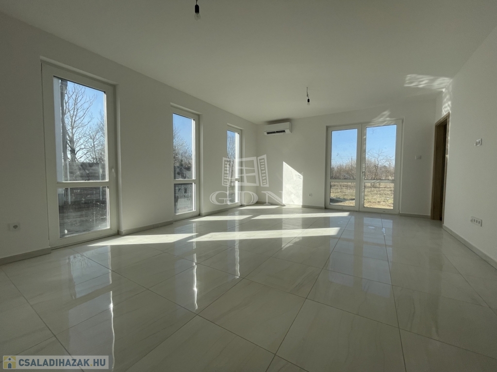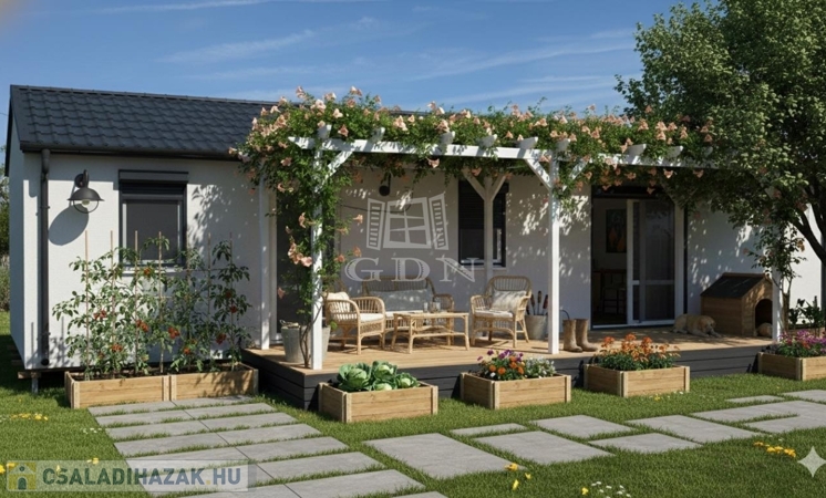 Kecskemét Felsőszéktó területén, új építésű, könnyűszerkezetes, 81 nm, amerikai konyhás, nappali + 1 szobás, klímás családi ház, fedett gépkocsibeállóval eladó. Ideális választás idősebb korosztálynak, vagy fiataloknak, akik nem szeretnének nagy kertet gondozni. Kivitelezésben szerződött partnerünk a mai kornak és igényeknek megfelelő, energia hatékony építő anyagokkal építi fel, vállalt határidőre otthonát. A fotók referencia munkáról készültek.