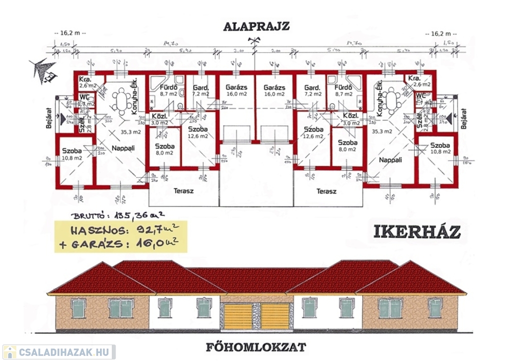Kecskemét, Felsőszéktón, a Széles-köz közelében, rövid földút megközelítéssel, dinamikusan fejlődő, csendes, új családi házas övezetben saját, külön bejáratú 750 nm építési telken új építésű ikerháza eladó. Hőszigetelt könnyűszerkezetes falszerkezetű, 92 nm, hasznos lakóterű, nappali+3 szobás, 15 nm burkolt teraszos, 20 nm garázzsal. Nyílászárók fehér színű műanyagok, 3 rétegű üvegezéssel. Hőszivattyús fűtési rendszerrel, padlófűtéssel és 1 db hűtő-fűtő klímaberendezéssel kiegészítve. A vételár tartalmazza a tervezést, kertrendezést, füvesítést, térkövezést, és a kerítést is.